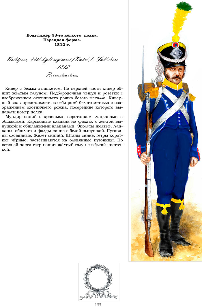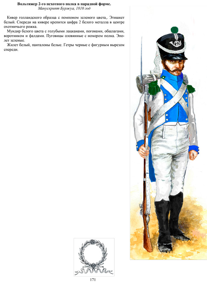 Во -первых это рисунок через 100 лет сделан после того как носилось Художник Рихард Кнетель. Во -вторых-я же уже указывал Вам выше ,что ромбы не всегда носились на кивере. В -третьх -на рисунке не вольтижер(!), а гренадер (судя по красному султану на кивере) Все зависит от полка и времени ношения предмета . Армия Наполеона-1 го не статичное образование ,как наверное и многие армии в других эпохах. Все менялось и довольно быстро и хаотично. Даже "железный "регламент от Августа 1812 года не выполнялся на 100 % И теперь еще идут споры между специалистами на тему -Как и что носилось. Период очень трудный ( отсутствие фото в те времена, и мизерное количество реальных предметов дошедших до нас.