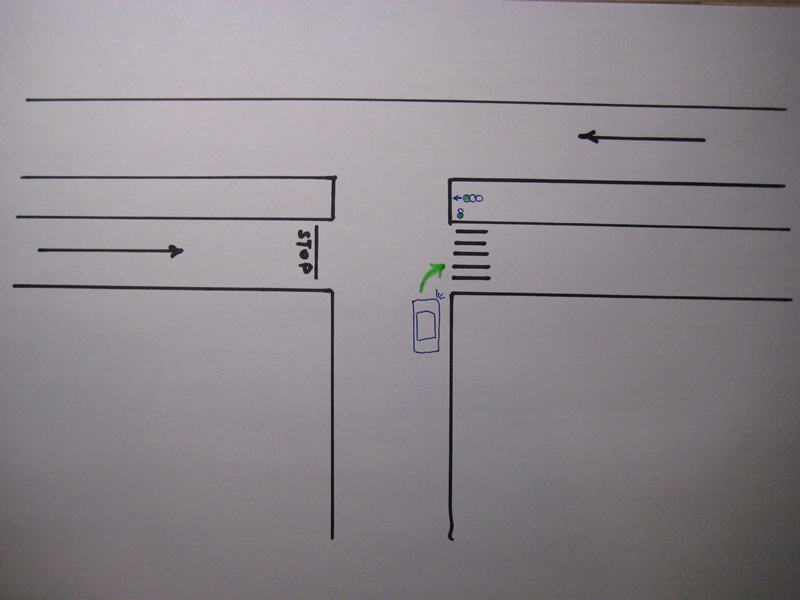 Читаю и трясусь от смеха. Судя по тексту пысал водЫтел прохфесыонал. Схема вааще улёт! Основной светофор размещается справа или над проезжей частью (слева только дублирующий) Дорожная разметка 1.14.1 "Зебра" обозначающая пешеходный переход не наносится на регулируемых переходах (перекрёстках). Наносится 1.14.3 и т.д. Учите Правила и будет Вам счастье. Только доскональное знание последних предаст уверенности на дороге и убережёт от быкрватых ГАЙцов. ИМХО.