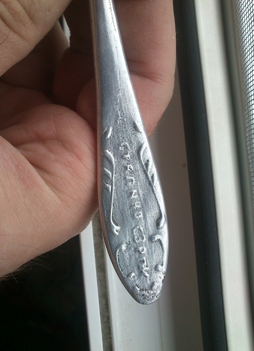 Наименование города "Сталино" (нынешний Донецк) было актуальным с 1924-го по 1961-й год, так что может и относится... Материал вилки, скорее всего, сплав на основе алюминия. Прочность не очень большая, поэтому, наверное, решили компенсировать толщиной. А может просто эстетики ради. Мельхиоровые тоже были достаточно объёмными.