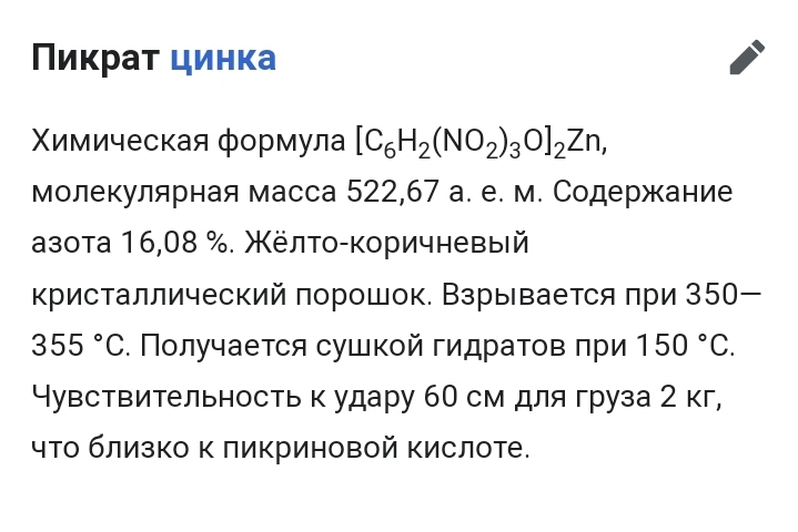 Пикраты могут быть получены действием на пикриновую кислоту гидроксидов или карбонатов соответствующих металлов, а также другими методами. Пикрат железа (III) Чувствительность к удару при испытании по методу Арсенала Пикаттини с грузом 2 кг — от 15,2 см для материала, высушенного при 150 °C, до 91,4 см для материала, высушенного при +25 °C. Пикрат железа II Чувствительность к удару при испытании по методу Арсенала Пикаттини с грузом 2 кг — 91,4 см. Ну почитал .. Учитывая тот факт что 1 стакан обработан , 2 образование гидроксида железа 3 или оксида железа 3 внутри обработаного стака Ну шанс настолько мал... есть ещё вот такие сведения , но они не совсем применимы к латунному взрывателю , да и чувствительность у них будет такая себе если они не обезвожены , а если по простому , то должна образоваться солянка пикрина и железа в достаточном колличестве. Ну шанс есть.. но честно непредсказуемый в условиях копа. ( тут на своё усмотрение как обычно))