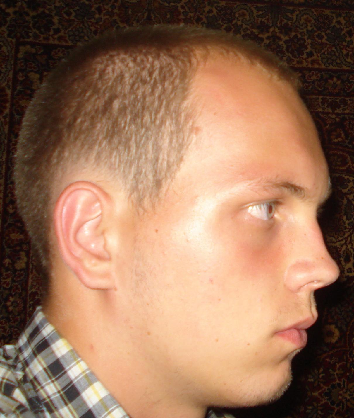 Лицо относительно узкое, нос и подбородок - тоже, светлая кожа, глаза и волосы; покатая линия лба, "сжатие" височных костей, прямая линия глаз и бровей - признаки нордической расы. Но череп с тенденцией к брахицефалии, но не угловатый как у восточнобалтидов. Лобные кости массивны, массивны надбровья (у нордиков - тонко прорезаны) - признаки кроманьеидных наложений. Линия черепа плавные, скулы не выражены. Черты лица мягкие, не такие "решительные" как у нордиков, нос немного вздернут (кончик носа). В общем есть и нордические, и восточнобалтийские и восточнокроманьеидные черты. Вот покамест так...