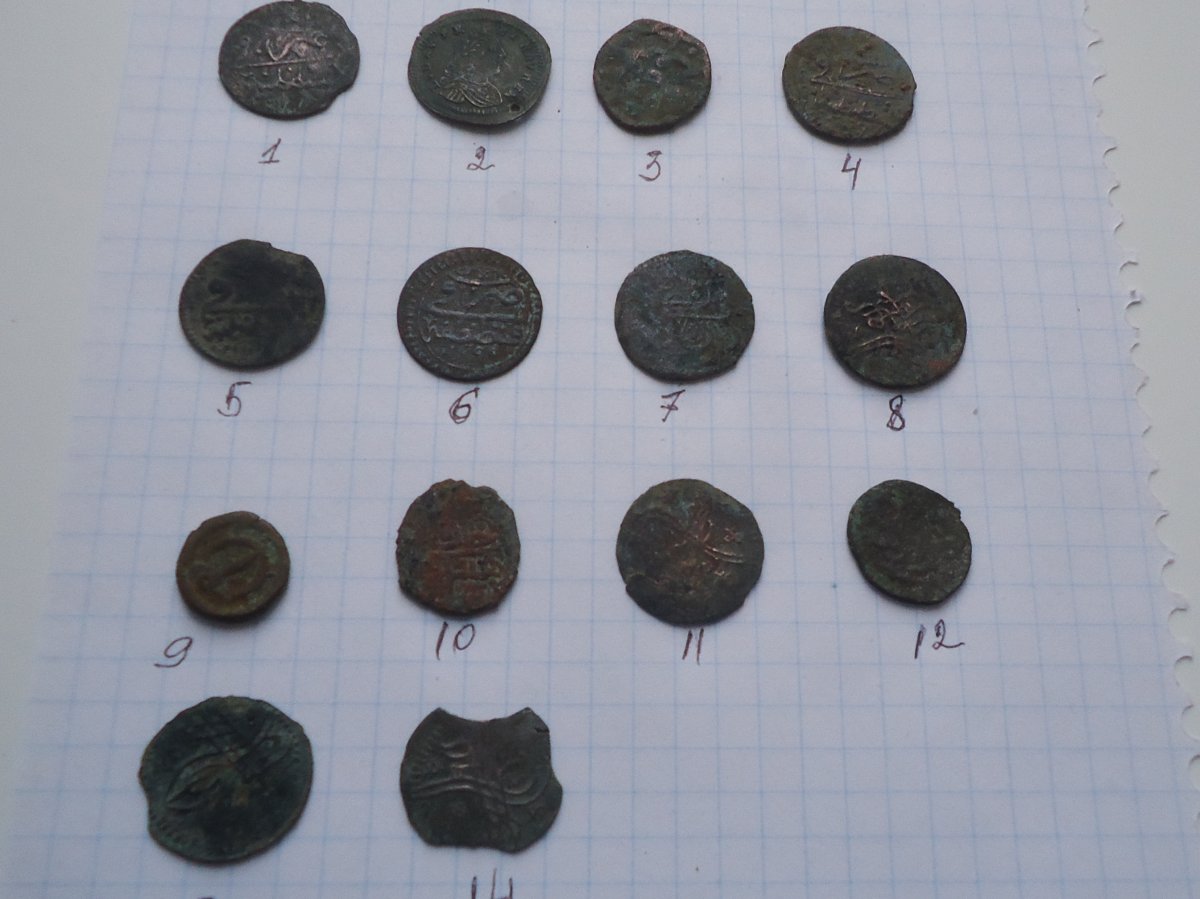 Добрый день. По меди: №1, №4, №5, №6, №8, №13, №14 - мангир, Османская империя, султан Сулейман второй, чекан Истамбул №2 - счетный жетон ( как определили камарады ) №3, №10, №12 - пулы, Золотая орда, для точного определения нужны хорошие фото... №7 - мангир, Османская империя, султан Сулейман второй, чекан Сарай ( встречается реже чем стамбульский) №9 - Византийская империя (как опредилил Кум15 ), оборотная сторона на фото не попала ... №11 - мангир, Османская империя, остальное по вашим фото не разглядеть ...