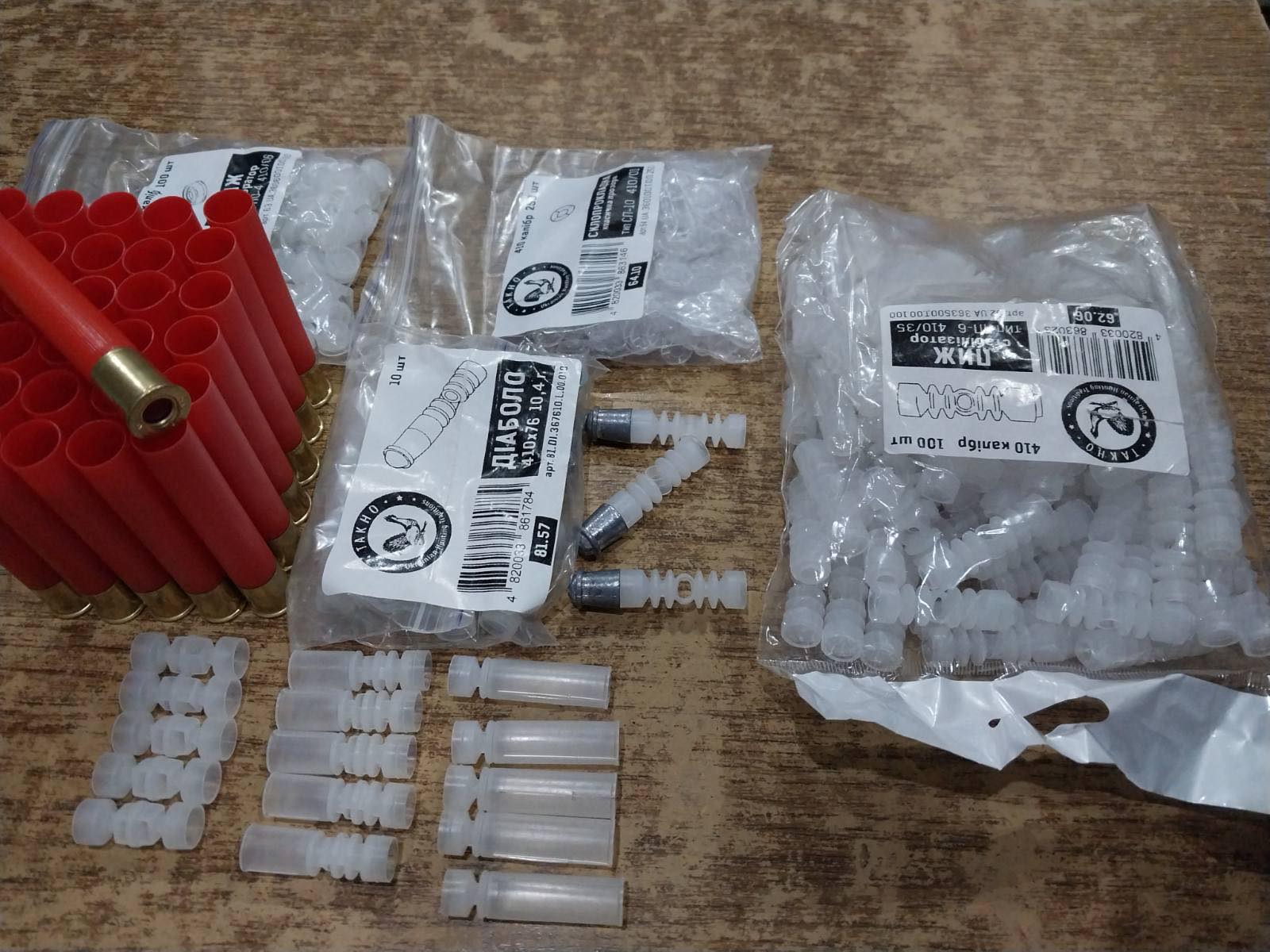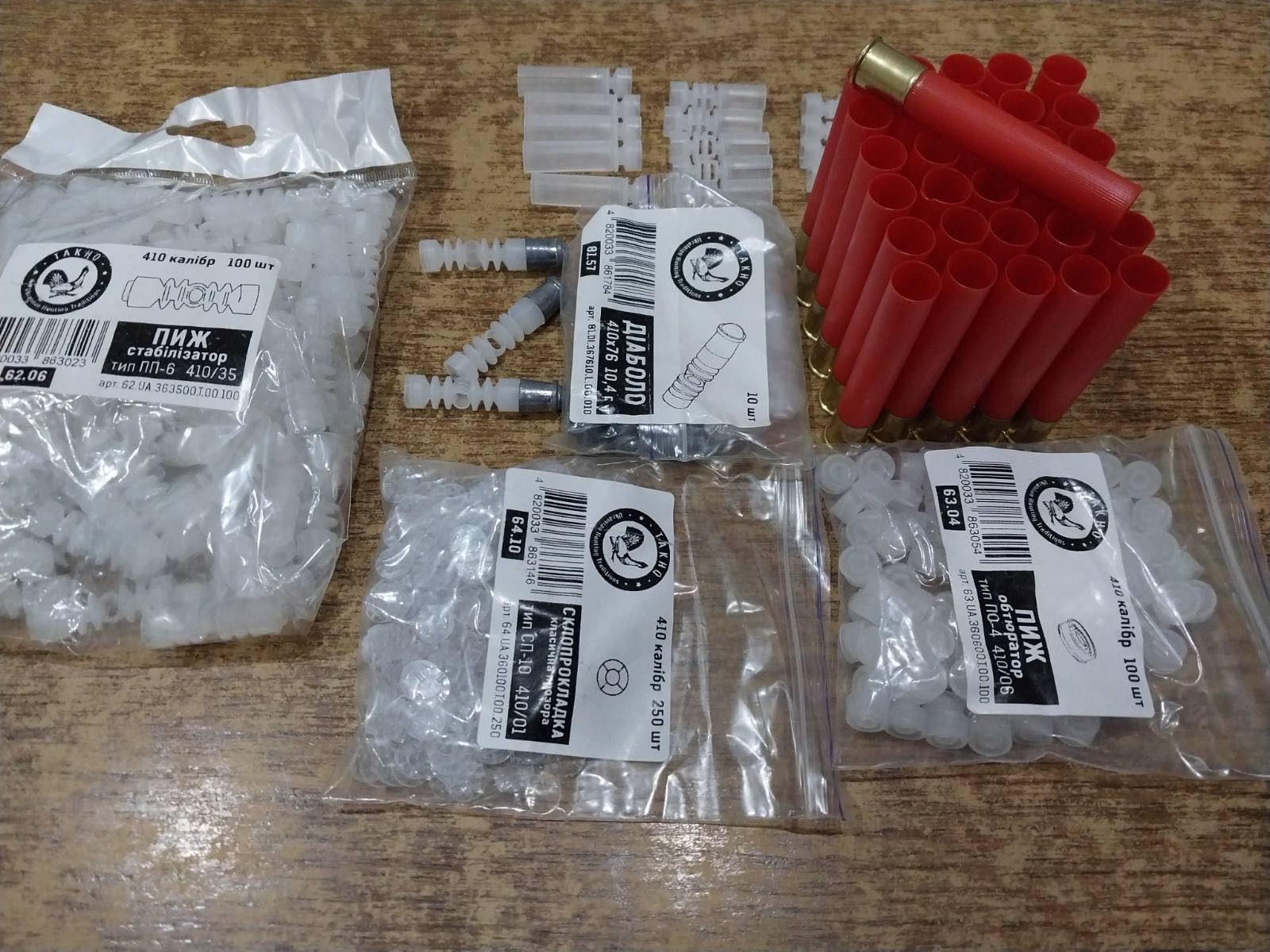 Все по 410 к. Гільза Fiocchi т3 36/76 кал410. 20грн шт.; Міні пиж Gualanbi H26 11/12, 36/410 , 3грн,шт. ;Пиж-Контейнер Gualanbi H33 11/12, 36/410 кал. 3грн шт. ; Пиж-контейнер Gualanbi H40 14,36/410кал. 3грн шт.Куля Діаболо 410/76 10.4г. 30грн шт. ; Скопрокладка прозора 250грн-250шт.; Пиж на порох (шашечка) 200грн -100шт.; Пиж стабілізатор 5грн ,шт