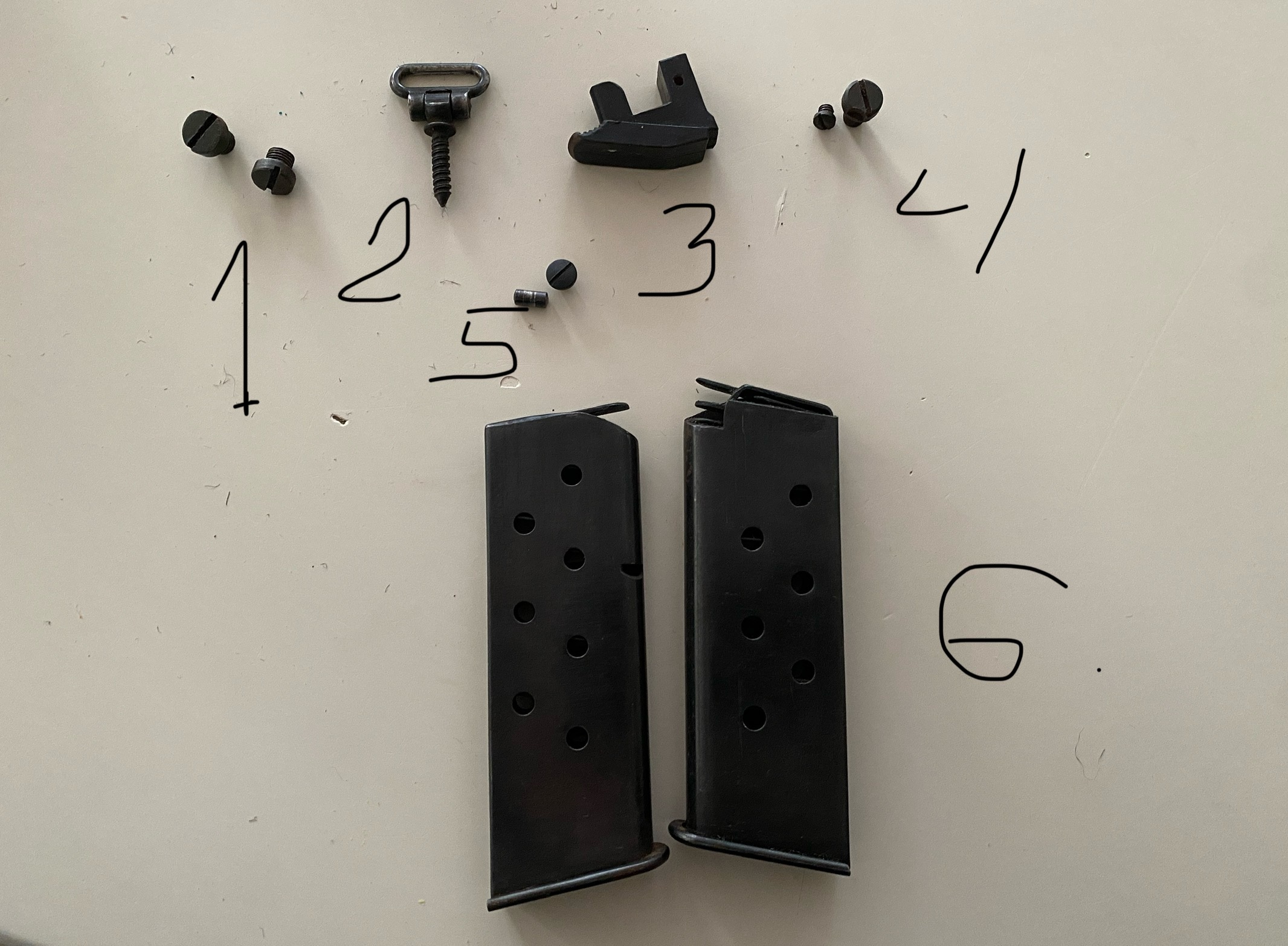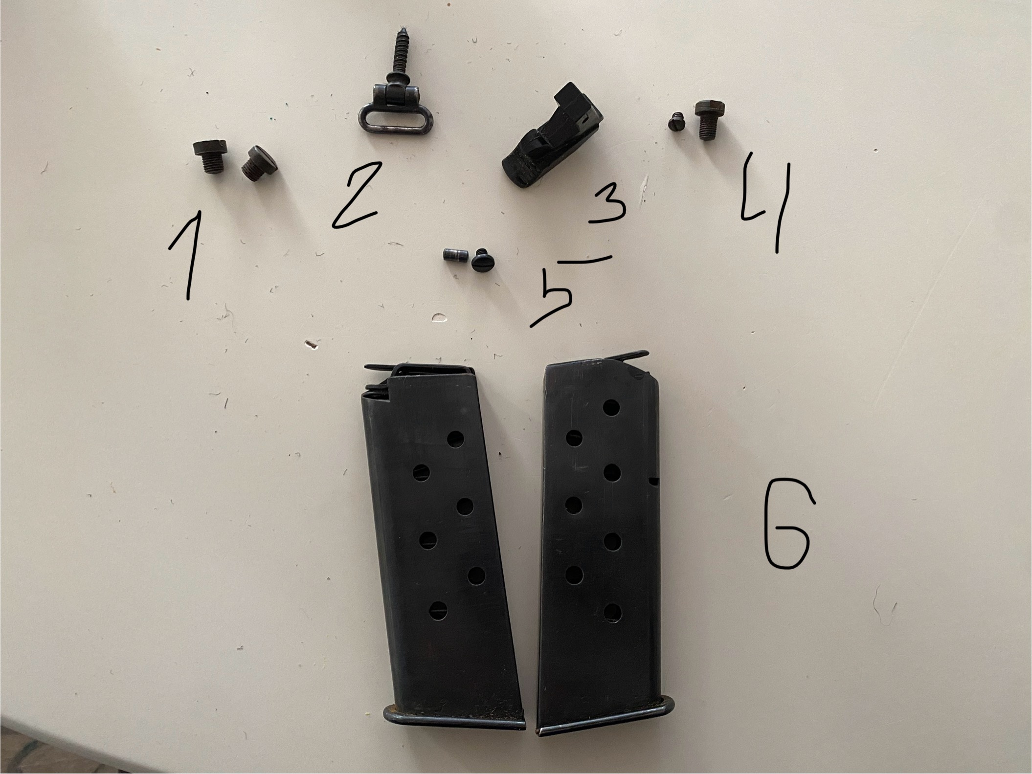 Добра Всім! Що може коштувати такі запчастини. 1). Гвинти шептала Мосін. 2). антабки на рушницю в супер стані 3). Пятка магазину МЦМ ( Марголін ) 4). Гвинт і конт гвинт на німецький карабін. 5). Помоему гвинт накладки Р08 і якийсь штіфт 6). Балаклеівські магазини до ТТ, поляна одна губа
