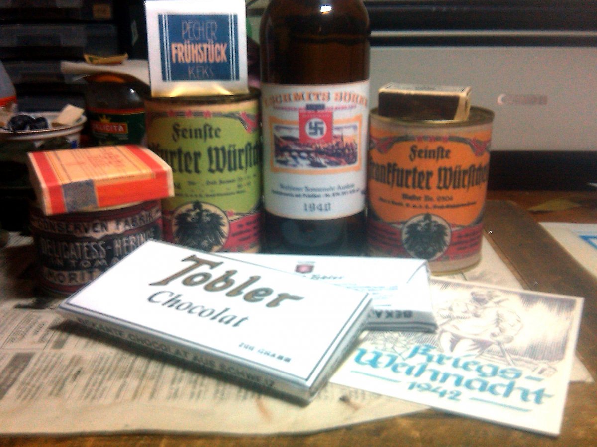 Я даже больше скажу, взяли просто современную этикетку, и вставили туда свастон (на примере значков охотников), надписи явно современные. Внизу объем и градусы написаны 4 cl 40 ml, 35 Vol- все это на тех же местах, что и сейчас на бутылке :) тушняк с орлами тоже некоторые выдают за оригиналы