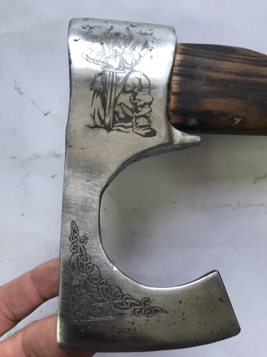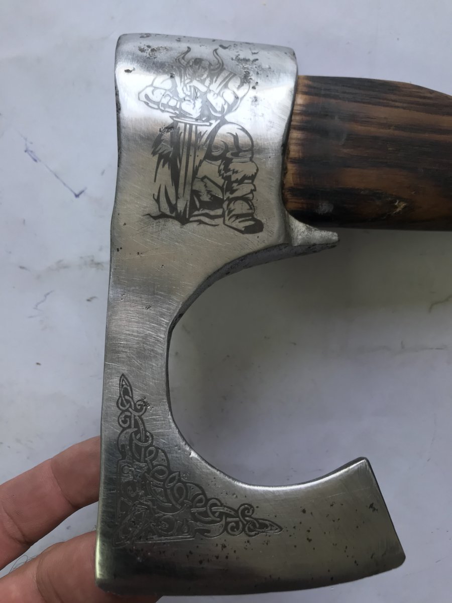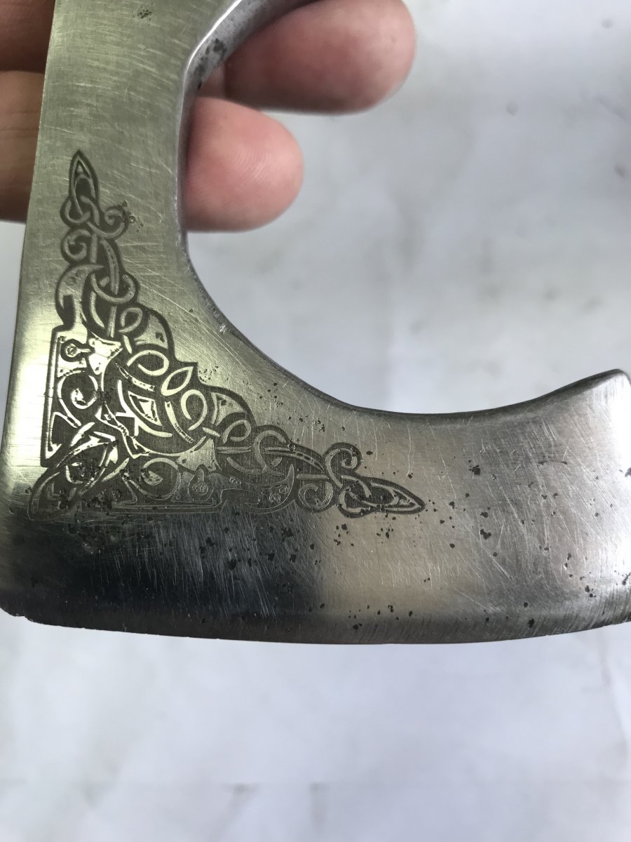 Был такой, вырез отлично работает как амортизатор и при ударе топор не так сильно бьёт в руку. А у вас есть болгарка? Ели да то Возмите леписковые круги 60-80- 120 и самый мелкий и уберите свидение. Леписковый круг отлично делает линзу и такой топор будет потом проще править и перетачивать. С ув