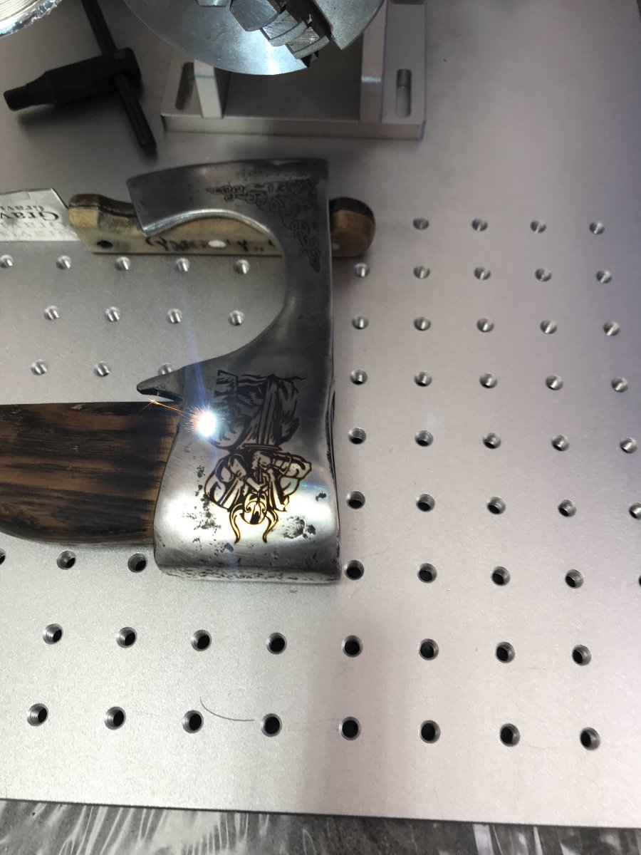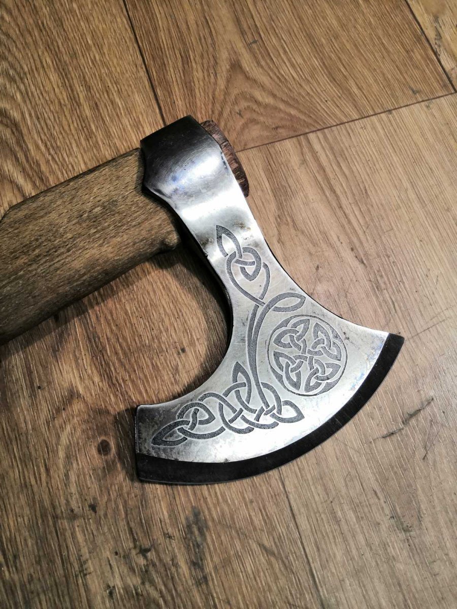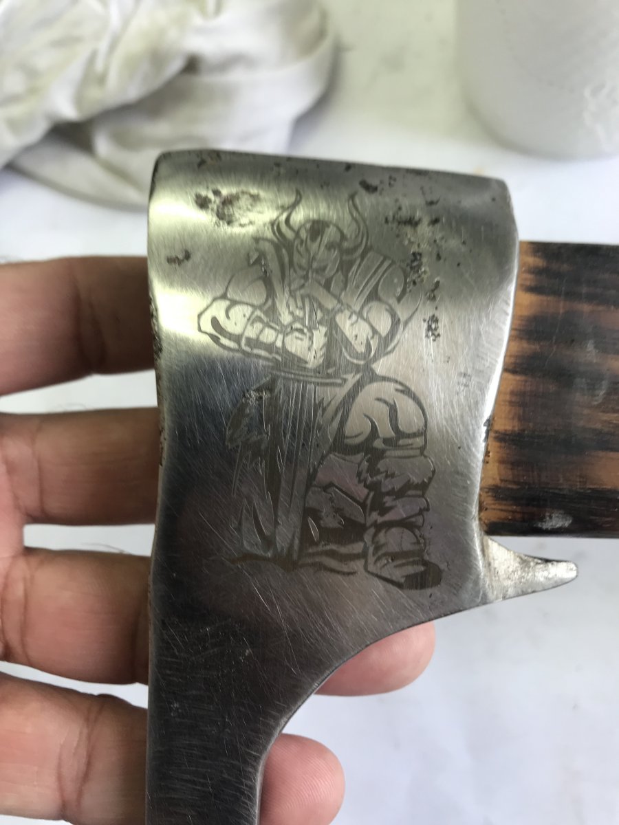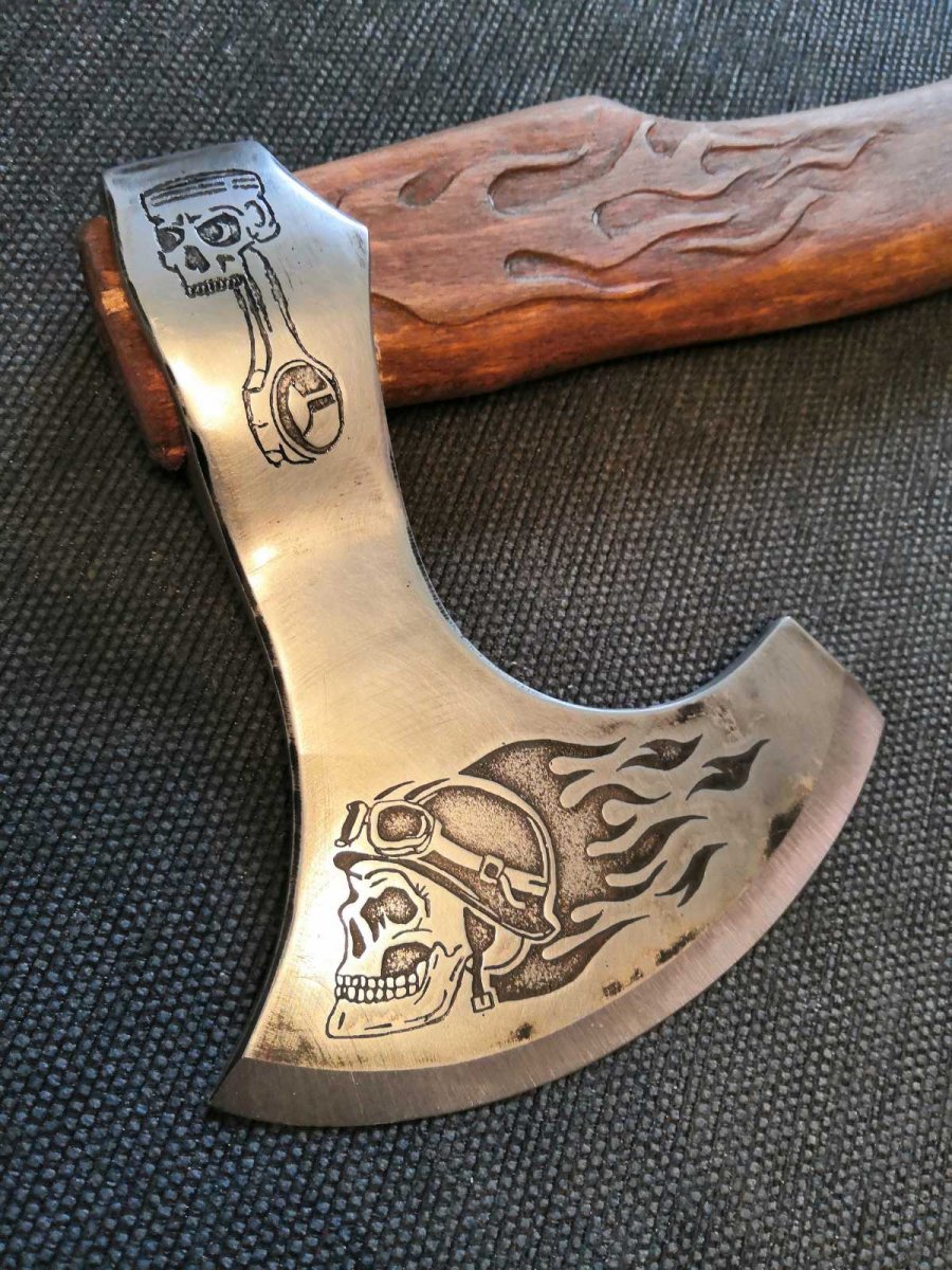 Был такой, вырез отлично работает как амортизатор и при ударе топор не так сильно бьёт в руку. А у вас есть болгарка? Ели да то Возмите леписковые круги 60-80- 120 и самый мелкий и уберите свидение. Леписковый круг отлично делает линзу и такой топор будет потом проще править и перетачивать. С ув
