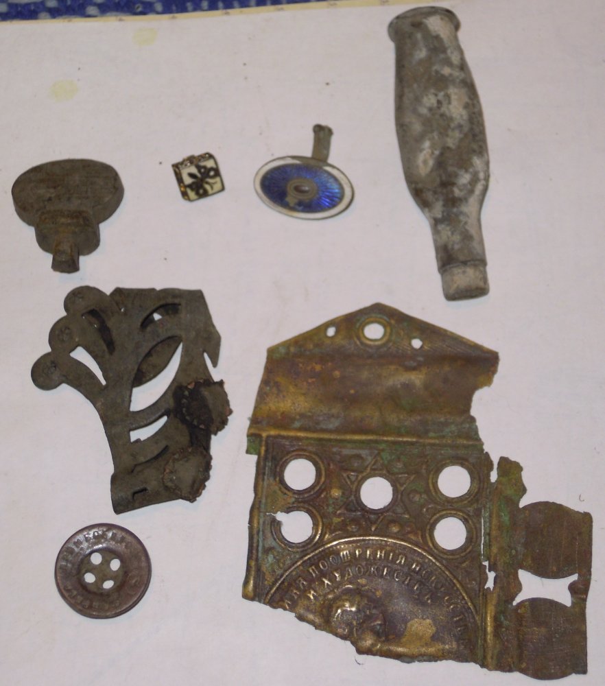Знатоки! подскажите по скромнуму хламцу,хутор выбит полностью,а в раёне больше нет где взрыхлить дёрн.Похоже запонки(чьи каких годков), много гильз и патриков Лейбеля,Манлихера и разный мосин часто попадаются пули перевернуты и засунуты в гильзу! чё ето за обряд?.Интересна накладка медь,надпись на ней(..ина поошрения искусствь и художествь,что ето и к чему,хотелось бы в оригинале посмотреть). и вот пуговица,уже вторая. Надпись на ней(фабрика промвоенхоз)мне так видется,серп и молот.еще попалась пуговка с орлом,если интересно выставлю.Подскажите по данным девайсикам.С ув!
