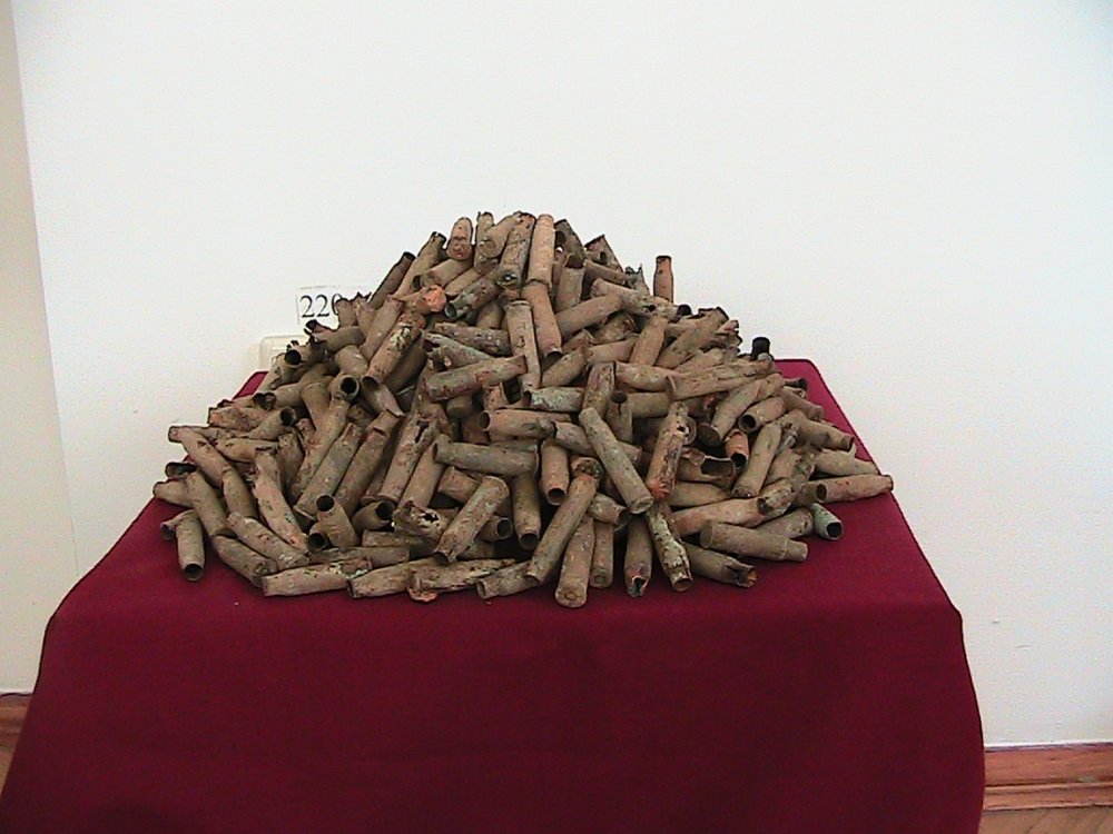 Да,забыл добавить вот такую кучку гильз.Под стеклом им места не нашлось и работники музея дали под них тумбу,только после моего заверения,что гильзы я не считал и считать не буду.И даже если кучка визуально уменьшиться,с моей стороны претензий не будет,наоборот,донесу ещё.Зав.отдела посмотрела,кивнула и вопросительно-утвердительно сказала"-Вы ещё накопаете?!".После утвердительного ответа,дала тумбу.