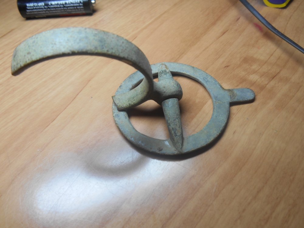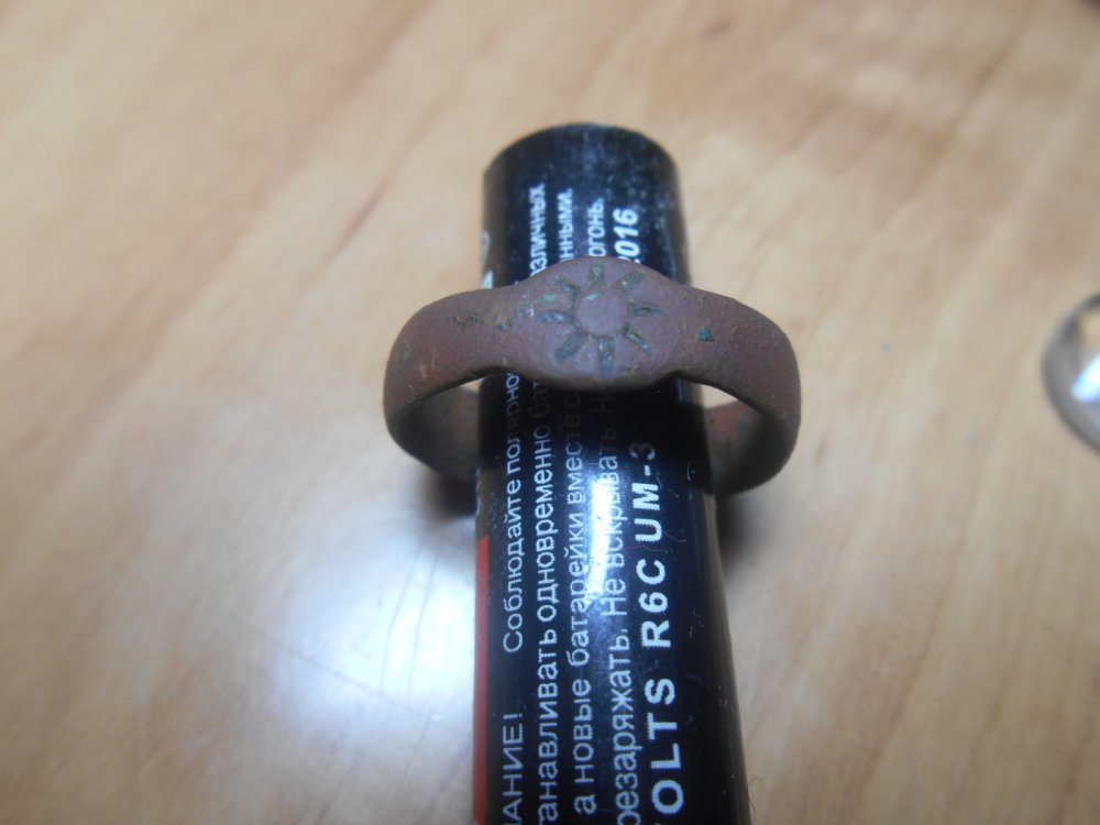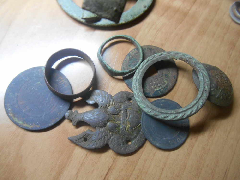 Проездом пару дней у тёщи возле Луцка.Договорился с владельцем ОГРОМНОГО поля сои,походить с аппаратом в местах где соя не взошла.Находок немного но день прошел не скучно..Лично для себя,помогите определить монету с отверстием,штуку похожую на пряжку и приблизительную датировку двух колец..Спс.