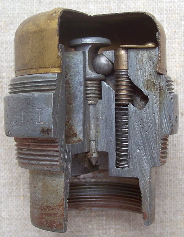 Приветствую камрадов.Нашелся такой взрыватель,вернее то,что от него осталось.Большой,из тяжелого сплава.Сразу бросилась в глаза абсолютно не корродированная пластинка похожая на контакт,скорее всего позолоченная.В инете не нашел ничего похожего,может кто прояснит,что это.С ув.