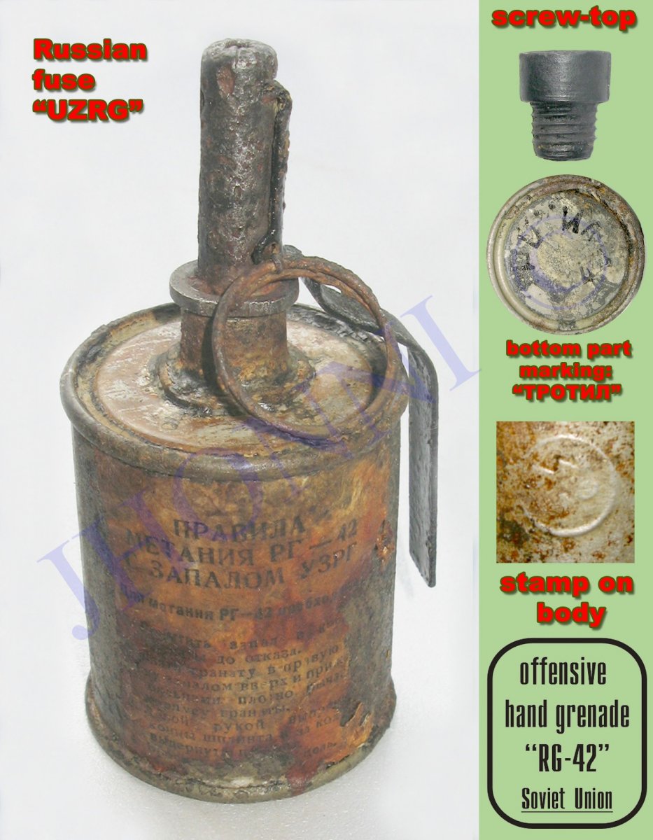 Вопросов нет. Это УЗРГ. Насколько я понимаю, УЗРГ раннего образца, поскольку сначала делали 8 лепестков, потом 6. Медный запал встречается на запалах Ковешникова, а тут добротное медное семейство (медная трубка). Наверное, завод-изготовитель имел на складах много таких запалов и обладал нормальной возможность делать всё из меди, но уже УЗРГ. Хотя в новых фото уже как и не медь, но сути это не меняет. Удивительно прикручен запал, что даже на более лучших фото выглядит как одно целое. Кстати, УЗРГ применялся не только на РГ-42, но и на Ф-1 и РГ-42В. Всем удачи,
