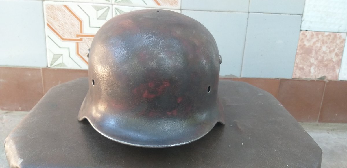 Там було все зрозуміло з самого початку. Не зрозуміло чи по чистому металі фарбувалося та яка під фарбою ситуація. Шолом не з частих та стан не поганий, тож зберегти сам Бог велів. Що стосовно противників нагріву то в цих шоломах в атаку не ходити бо від них толку буде як від кашкету. Після гарної очистки добряче промочіть його в перетворювачі іржі, добре протріть на сухо, висушіть, ще рас протріть можна і чистою щіткою дротянкою, загрунтуйте і лише тоді приступайте до шпаклівки. Я для таких робіт використовую клей двох компонентний на основі епоксидки, добавляючи чуть фарби майбутнього кольору шолома. Але це вже на любителя чим шпаклювати.