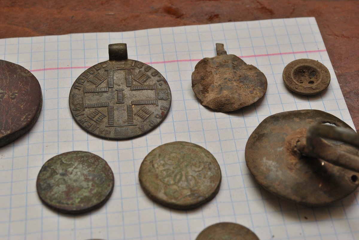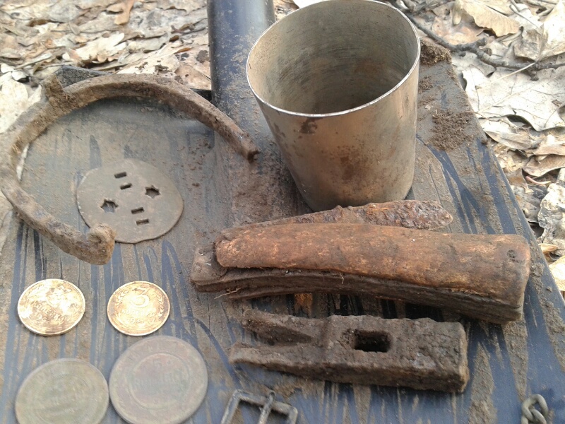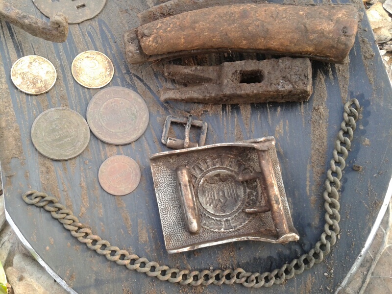 Сегодня насобирал "рариков". Так получилось, что забрёл на окопы, на которых, наверное, отродясь ничего не было. Был там пару лет назад. Кроме настрела ничего там не попадалось. Их всего там около полтора десятка и находятся возле одной из главных дорог через лес. Не копал там, наверное, ленивый и тот, у кого нет прибора. Первой выскочила сапожная подкова. Думаю, раз что то попалось, дай похожу. Затем нож. Рукоять - кость. Неплохо. Люблю такие вещи. Следующий мощный сигнал прямо возле бруствера. Ёлки-палки! Стакан! Материал - латунь. Как его можно было пропустить? Очередной слабенький чернявый сигнал на бруствере следующего окопа. Молоточек с гвоздодёром! Хотел идти дальше. Но, что то во мне сказало: стоять! Пришлось потрудиться и убрать молодое ветвистое деревце, упавшее на этот окопчик, чтоб пробежаться вокруг места где попался молоточек. И не зря! Следующий цветной сигнал рядом с молотком-пряжечка. Пока не знаю с чего она. И буквально сразу же - мощнейший цветной сигнал! А вот этого, я в этом лесу и не ожидал, не надеялся и не думал увидеть. Не говоря, уже, в этом месте. Achtung! Partisanen!