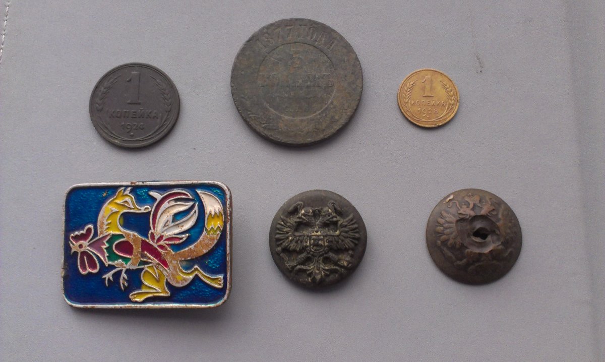 Сегодня посетил тот лес, что и в прошлый раз, только пошёл совсем в другую сторону, сигналов практически не было, но результат меня порадовал, что не сказать о погоде. Подскажите по ss значку и монете ( серебро, попалась такая впервые, кстати вместе с остатками горшка)