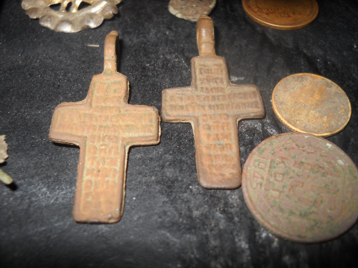 Фото находок с субботнего невдалого копа.Невдалого потому,как от места ожидал большего. Два целых крестика с одной ямки.Похоже были утеряны совсем новыми - остатки литья , нет износа и потёртостей характерных для носки. Пуговица - Бух, "18" . Всем удачи,хороших находок, мира и здоровья!