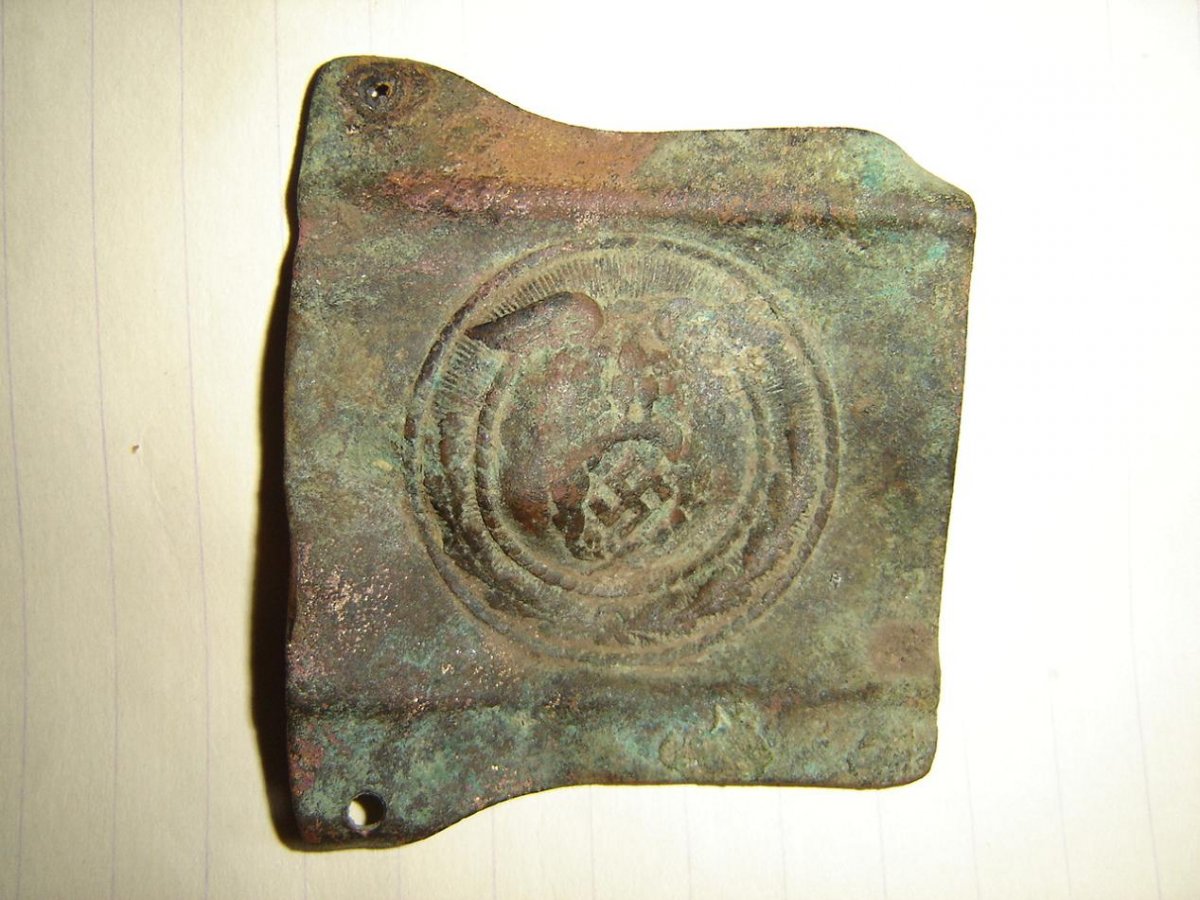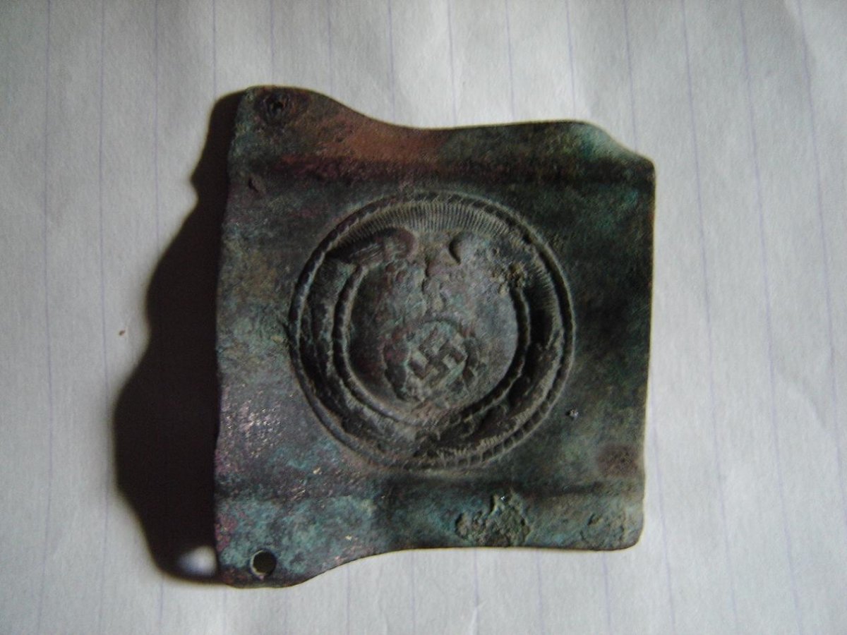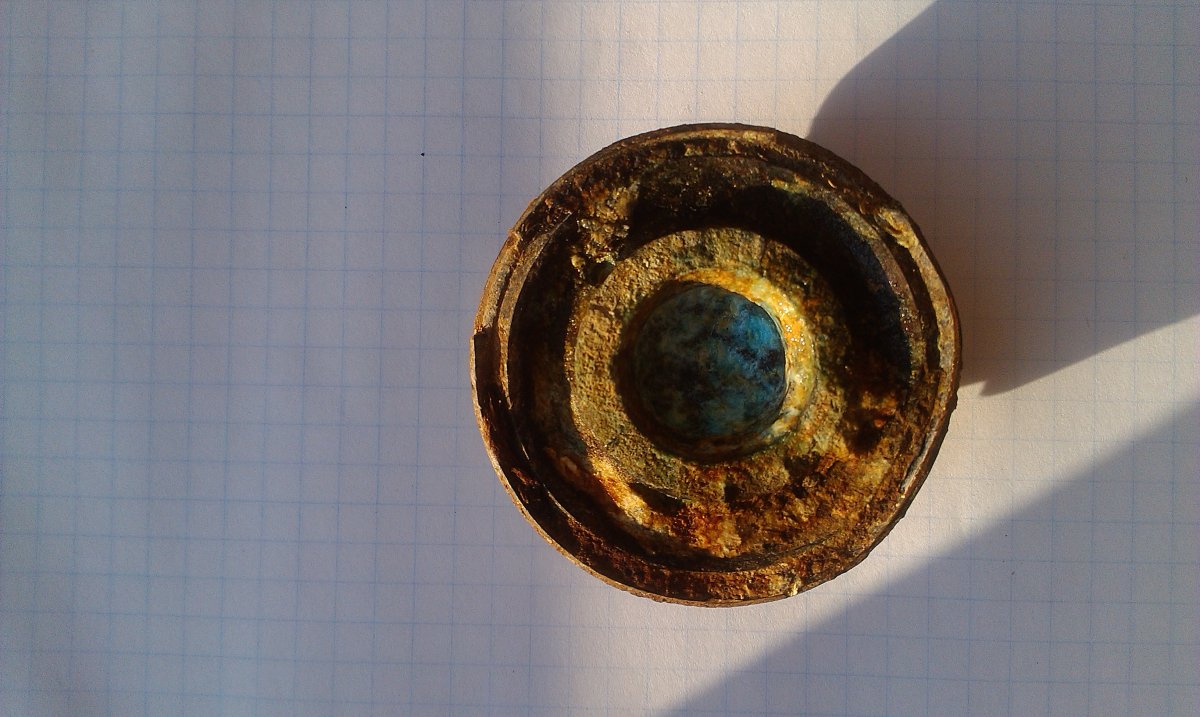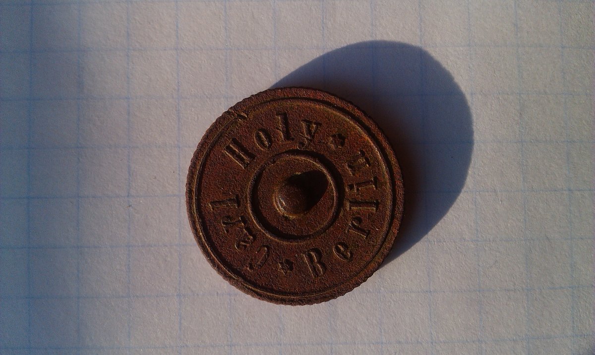 Добрый день! Среди военного шмурдяка попались 2 непонятные мне вещицы, может кто что подскажет. Особенно интересна маленькая, с надписью, похоже отламалась на центральной оси, а вот была заклепана или прикручена - не понятно. А вторая - была прямо в корнях пенька. Повозится пришлось, пока достал. С виду чистая латунь, от чего она?