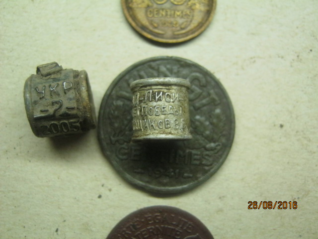 У меня тож по скромному,но чего сфоткал-скажите две обичайки,я думаю на ногу птицы окольцовка.Написано:Ворошиловград-Лисичанск квр.40 лет Победы д.9 кв.21 Голощаков В.Е.;на втором:УКР-7-2005 160.Может с голубей почтовых?