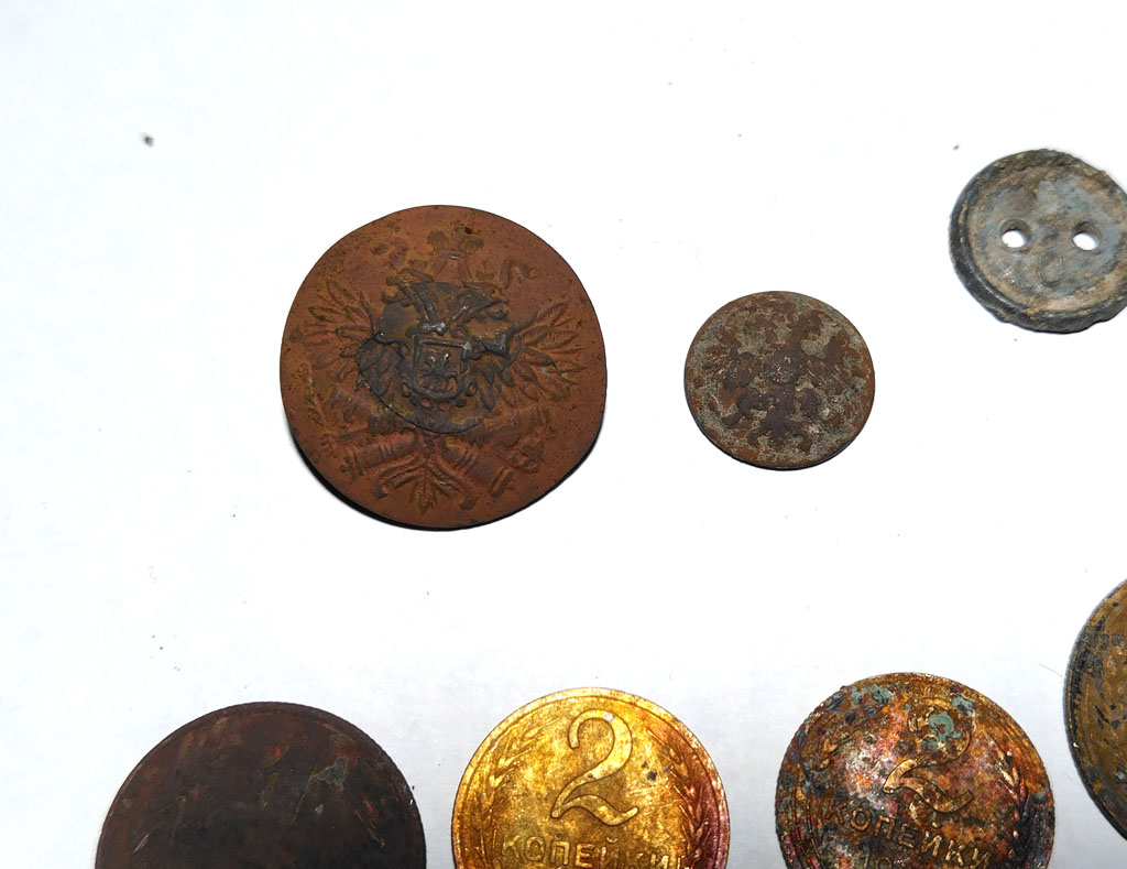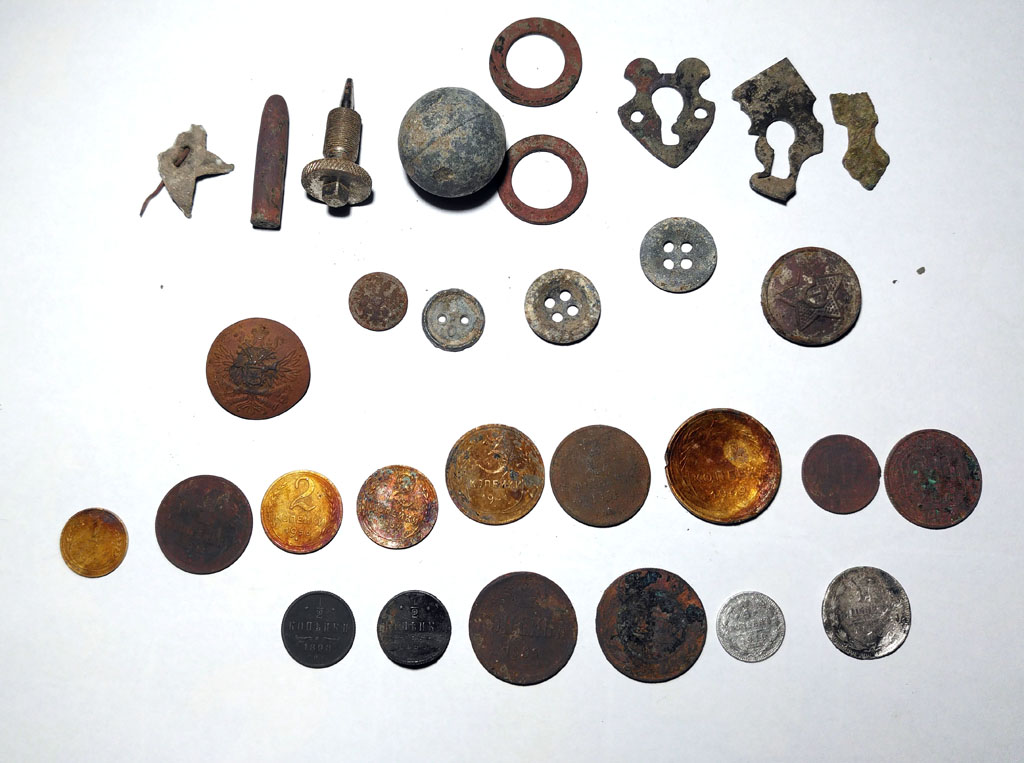 Сегодня нежданно выгорел выходной, поехал побродить по старому лесу, но на новые места, ушёл в глубину, даже осколков не было, но чуть дальше вышел на полянку 20 на 20, можно даже прибор не включать, звенит всё, в общем упал там какой то ганс самолёт, кое что целое удалось выловить.