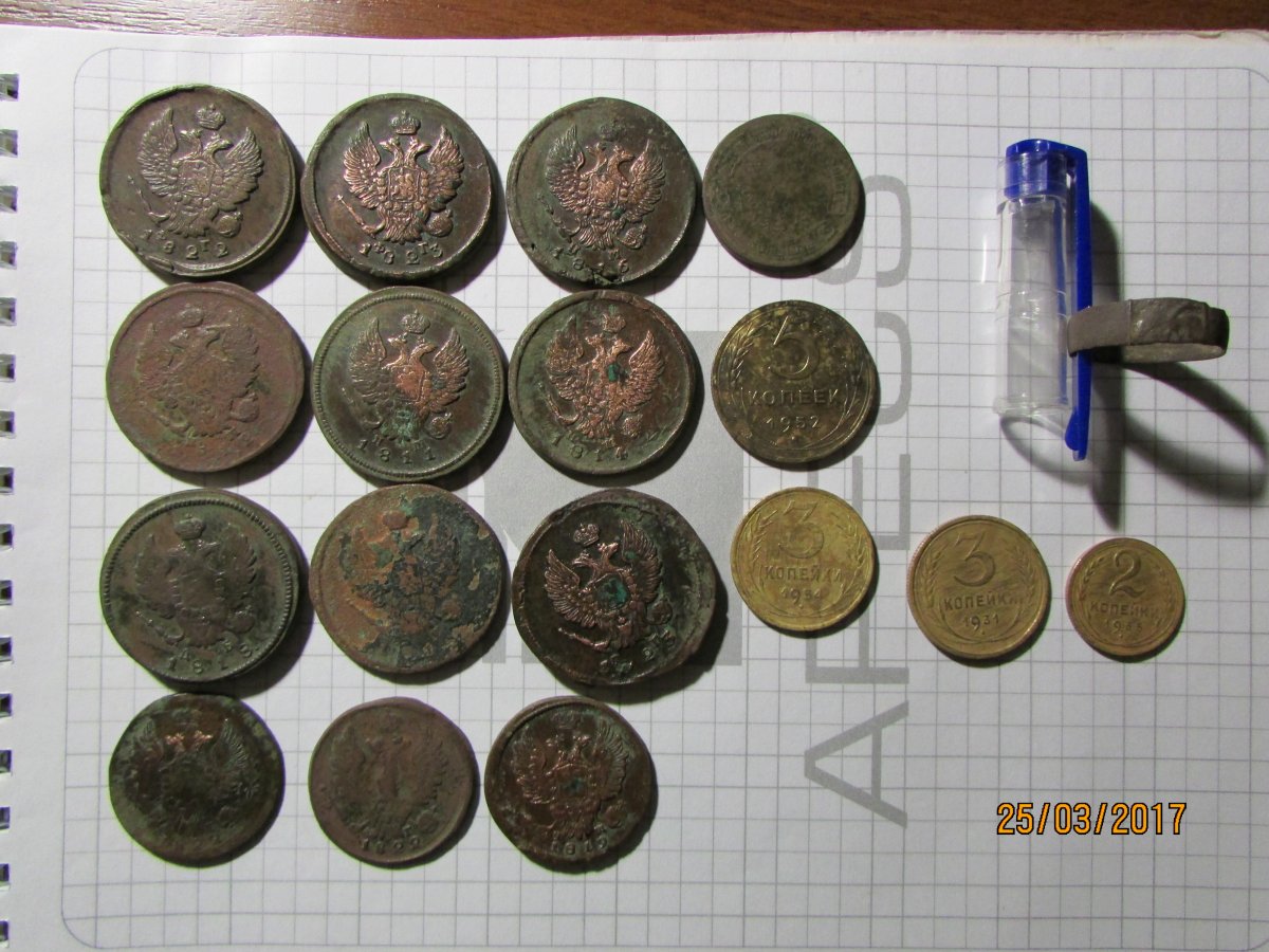 Всем привет! Выбрались сегодня. Попался кошель с царицей полей, 8 штук из одной ямки. Ценности никакой, но приятно. Первый раз все таки. Ещё какая то копейка, то ли на остатке отчеканенная. Какое то колечко, то ли лошадью и наездником, то ли хз. 4-м камрадам, искавшим в окрестностях Яковлевки привет!