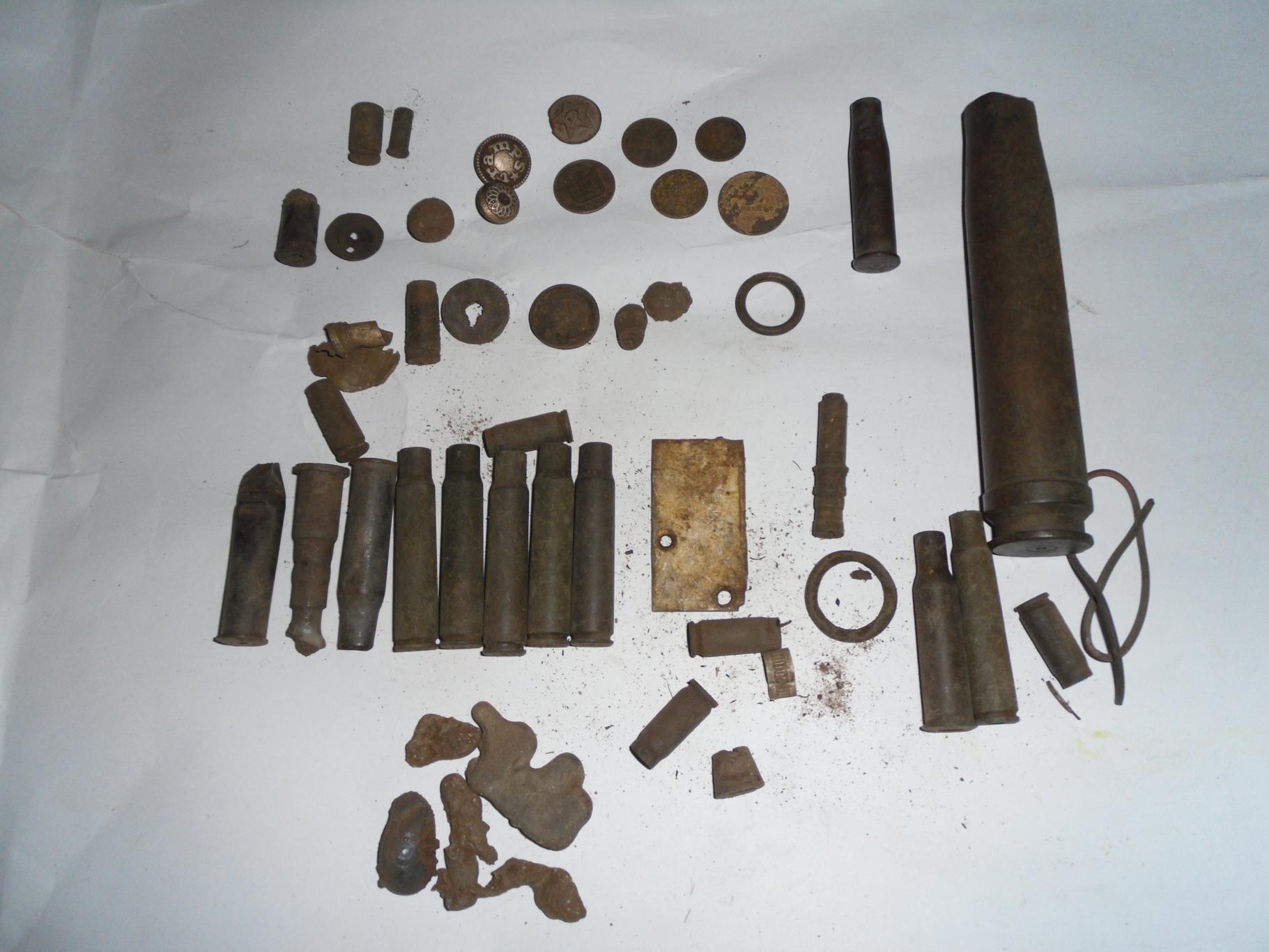 Вчера отговаривал камрада копать, потому что холодно, а сегодня сам не удержался, собрался и в лес. Погода отличная - тепло и солнечно. Правда с обувью не угадал, ноги промокли. Взял с собой топор ( рубить мерзлую землю), но он был лишним. Земля под снегом совсем не промерзла. Копать одно удовольствие - не холодно и не жарко. Лёд попадался только у стволов деревьев. Сигналов уйма. Нашёл нетронутую немецкую траншею. Много немецкого настрела. Порадовали гильзы. Некоторые очень редкие в наших краях. Попались гильзы 9х17 Браунинг, 38 Smith & Wesson, 9х25 Маузер ( знаменитый пистолет С-96 "Красная девятка"), латунная 20x138 Солотурн. Кстати латунные Солотурны редко попадаются, в основном идут стальные. Ну и немного монет СССР. Редкие гильзы думаю остались от деникинцев. Они вели бои в наших краях летом 1919г.