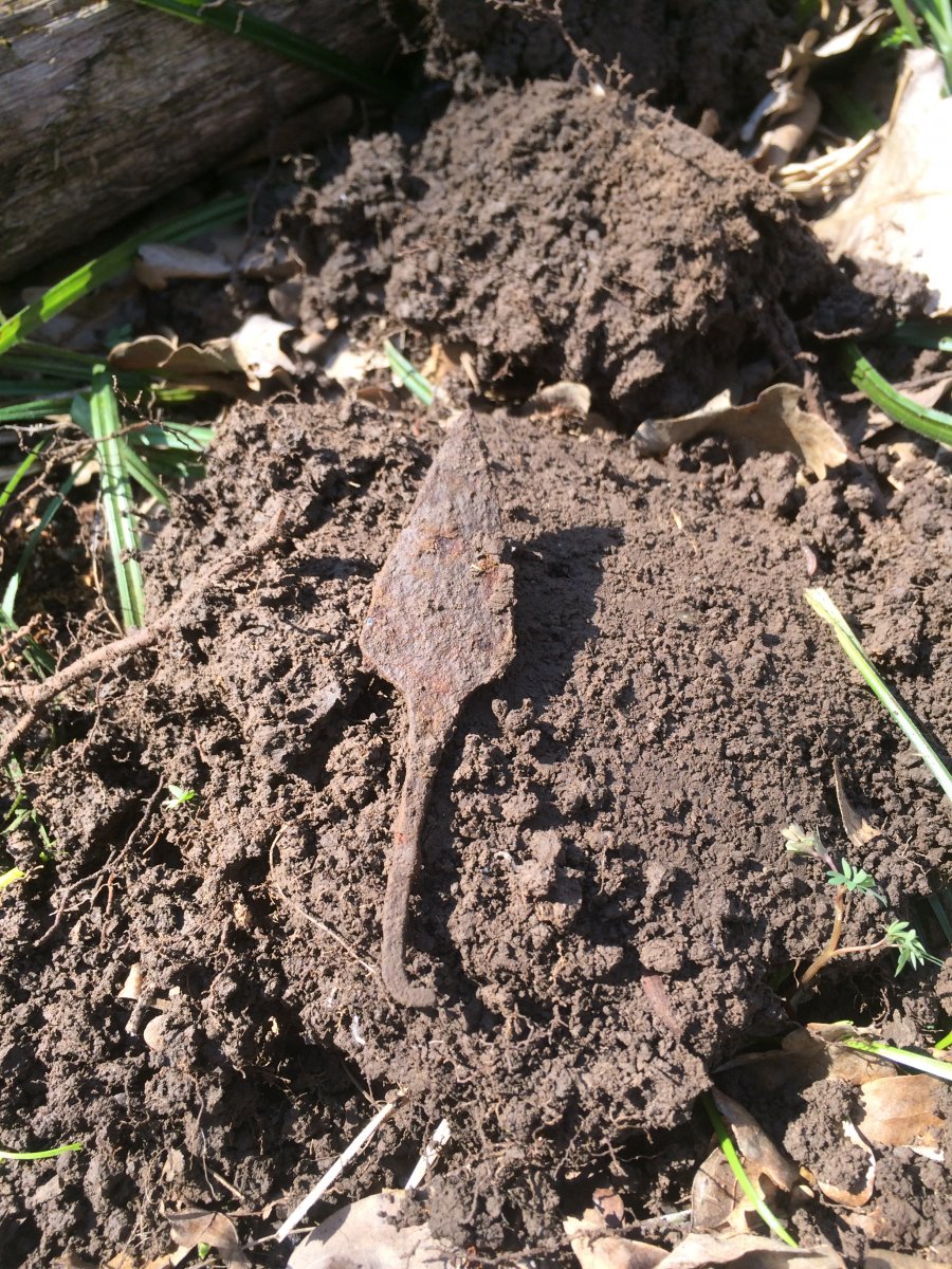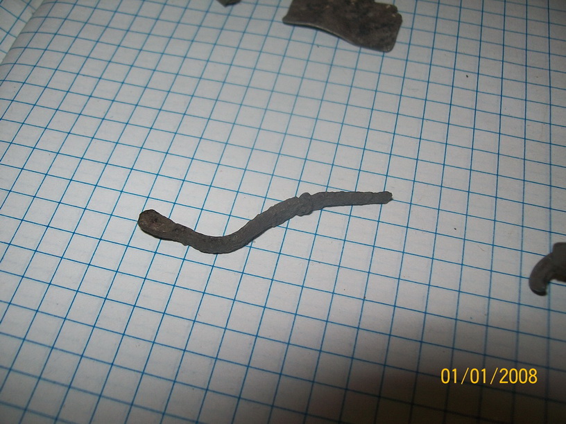 Здравствуйте,мой улов,перстенек вижу щит,копья и ядра-видать пушкарный.Вот с тонкой бронзы формы ведерка вещица,рядом была две цепочки и нож-по мне так "лампадка" видится,может что подскажите.