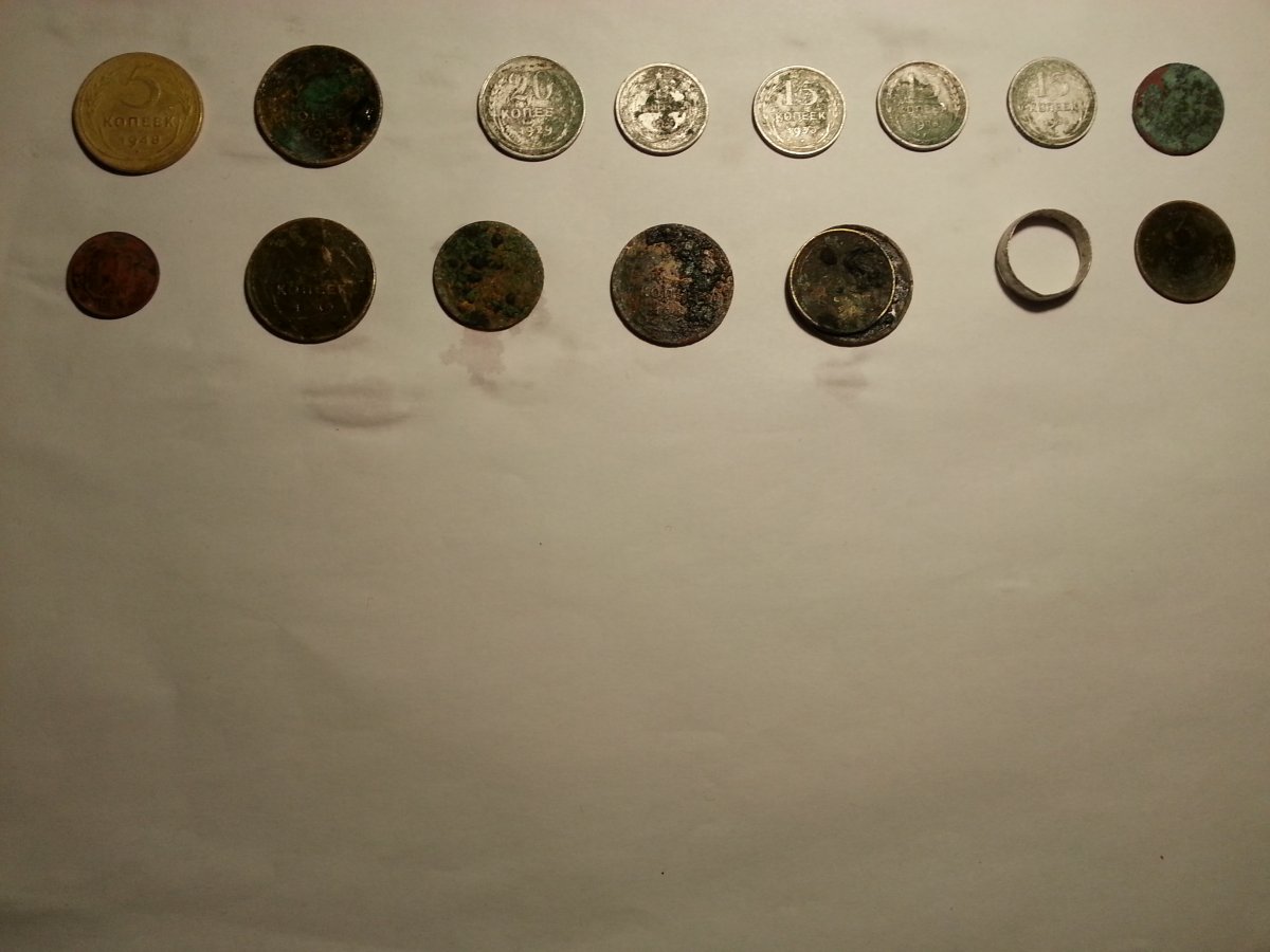Мой коп. Советы,первые билоны. С 2 по 8 монету нашел в одном месте, типа залипухи. Напрягся сильно), так как выкопал сначала 3 монетки, а остальные еще торчали в стенке, но сколько их там было непонятно. Колечко непонятное, но тоже зеленое...оно как покрашено серебрянкой...клейма пока не нашел. Империи нет, значит место появилось после революции(.