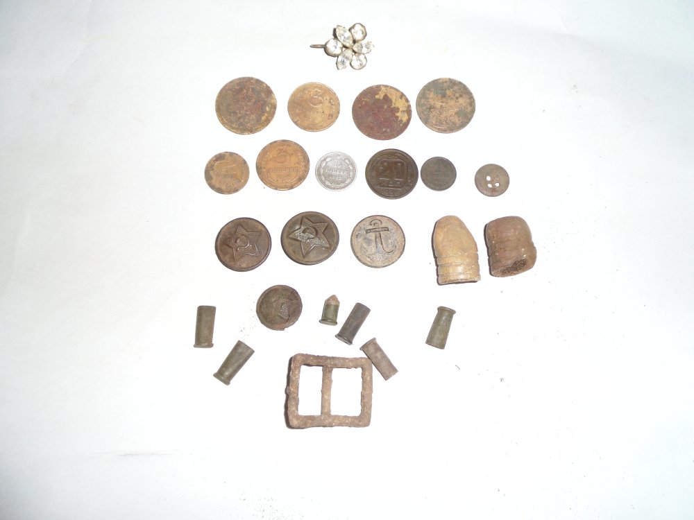 Вот результаты сегодняшнего выхода. Порадовала серебренная брошь с камнями и 2 пули Минье времён Крымской войны. Да, попались какие то шильдики с фамилиями и гора гильз, в основном ППШ и Маузер.