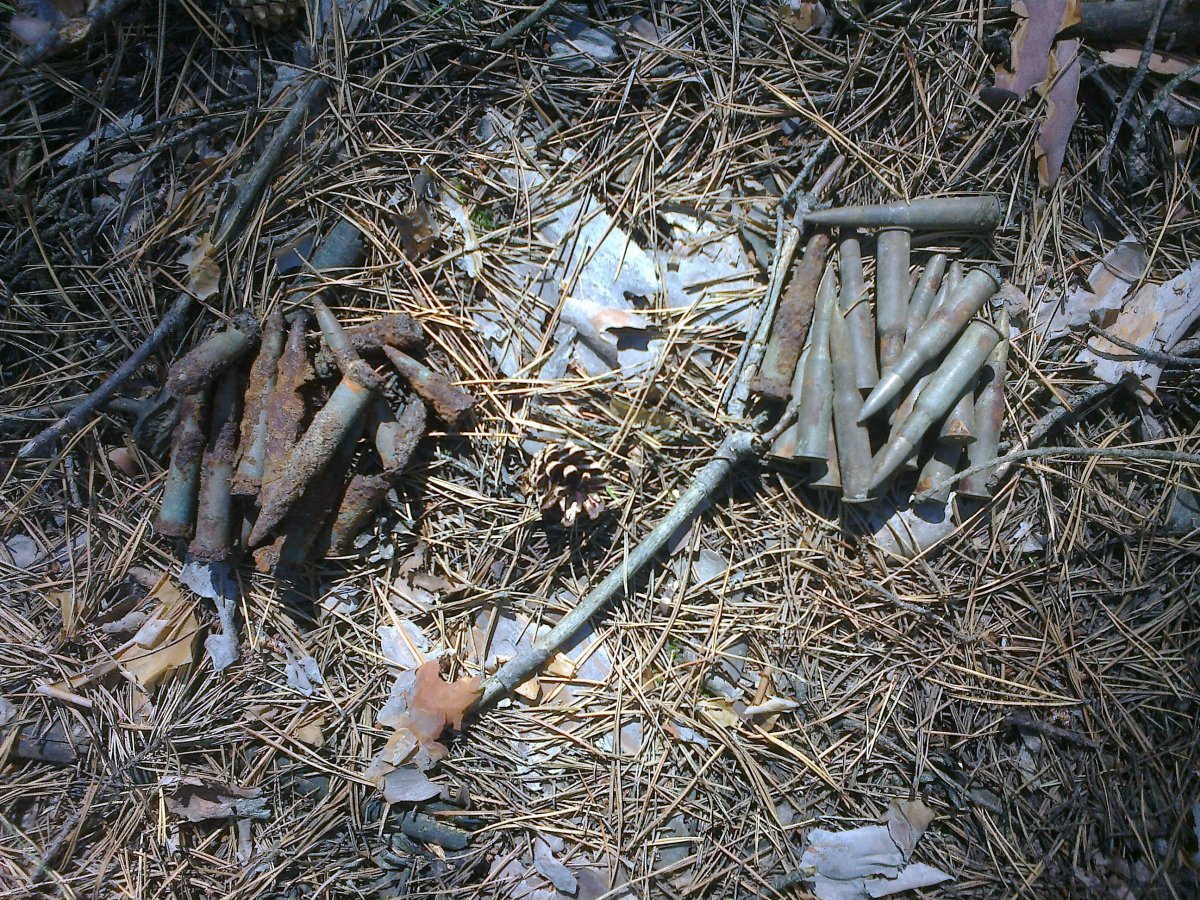 Всем привет!Сегодня опять поехал в Боровской р-н в проверенный лес,стальные патроны оказались для ШКАСа и благодаря тому что лежали пачкой один экземпляр с фиолетовым кончиком пули сохранился более-менее и пошёл на макет ибо таких в сохране ещё не находил.Латунные тоже лежали пачкой даже остатки картона сохранились и тоже хорошо сохранились в жёлтом блеске,даже ломать жаль было но пришлось а порох сжёг.Из монет 20 коп 1935 г и 1 коп 1935 г,остальной шмурд в виде гильз и пачки для каркано не было времени фотать-между электричками мало времени