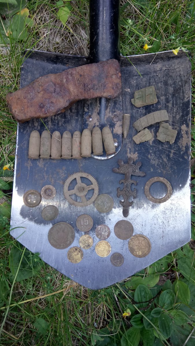 Доброго времени суток Камрады! Не смотря на жару, решили с товарищами выбраться на коп с ночёвкой. День археолога встретили ударным трудом. Ночевали в селе у товарища, благо озеро у него в 15 метрах от двора, охлаждались регулярно. По древности, скифский топорчик и фибулка ПК. Монеты СССР и одна Александровская двушка 1816г. " Пузанчиков" 45 кал. поднял среди россыпи настрела из ППШ. Все ВОП, были благополучно утоплены. Добра всем!