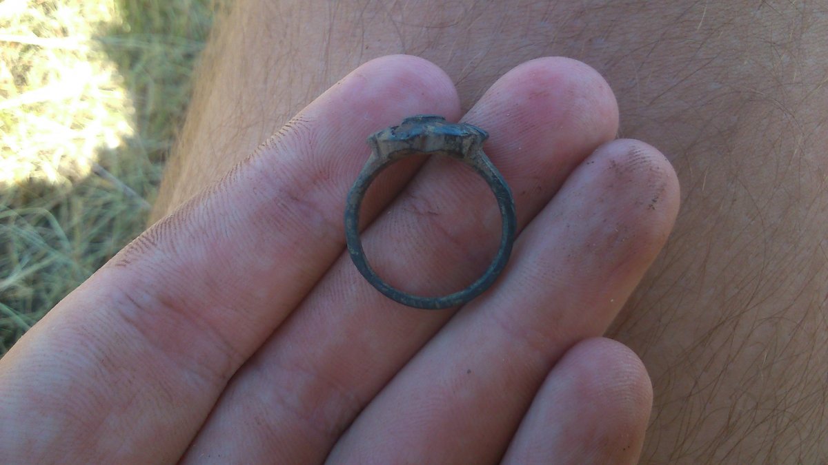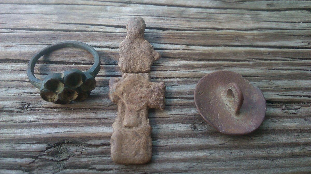 Сегодня день крестов - у меня и камрада по кресту) И так же с 7 до 16 в полях и лесах. Может кто подскажет по перстеньку(рубанул не я) - каких годков будет. По центру бардовый камень и четыре розовых камня по углам. По весу как аллюминий, может быть бижутерия? Ну и про пряжку с бегущим теннисистом, ничего в инете не нашел...