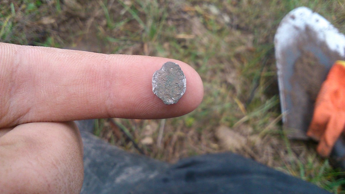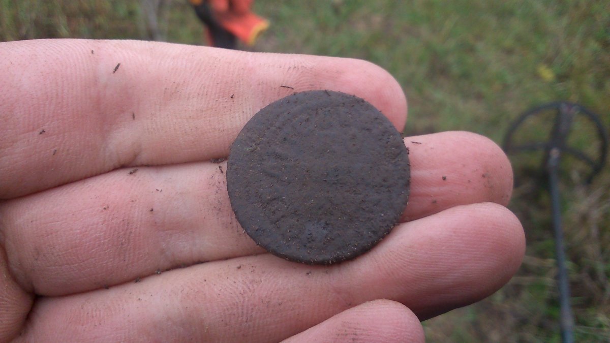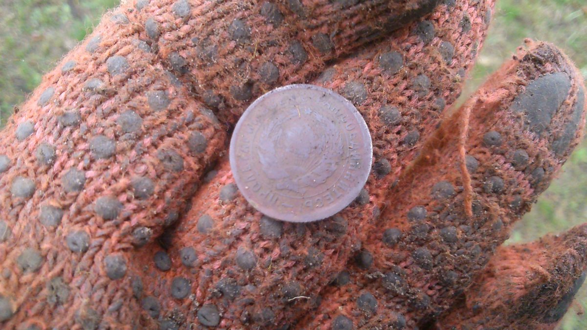 Решил попытать счастья на битых полянах, ставя на мокрую почву. И не зря! Первый же монетный сигнал и вылазит ОНА: