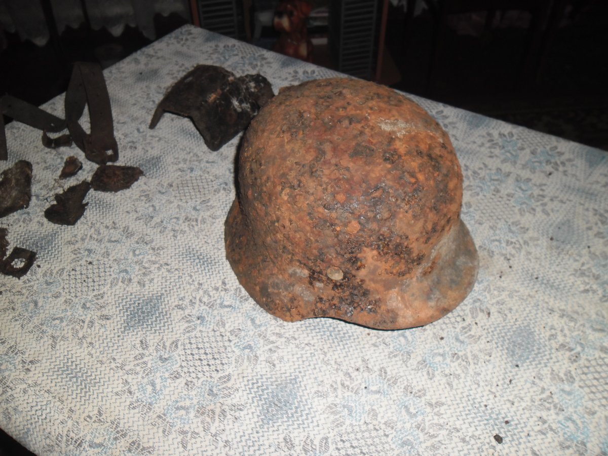 История... край окопа захватил мусорку начал раскапывать откинул лопату земли в сторону решил проверить ее. сигнал цветной с переходом на черный копал там кто то яму на два штыка еще штык и она. Лежала куполом в низ вытрусил с нее землю выпали остатки кожи и подушечка. В мусорке найдена тарелка\ на фото\ остатки бакелитового стакана с фляги \ ганс\. Итоги копа три монеты дореформы. две пуговки с кителя\ ганс\. подкова.остатки тарелки. остатки стакана.остатки ложки с надписью\ на фото\. части ленты с мг \ лежала в куче настрела\. Когда шли домой встретили стаю диких собак. Это возле Мохнач Змиевского р-н. Если кто планирует туда поездку будте внимательны.