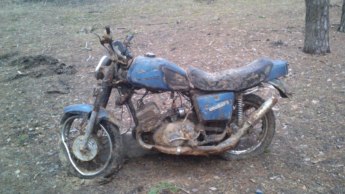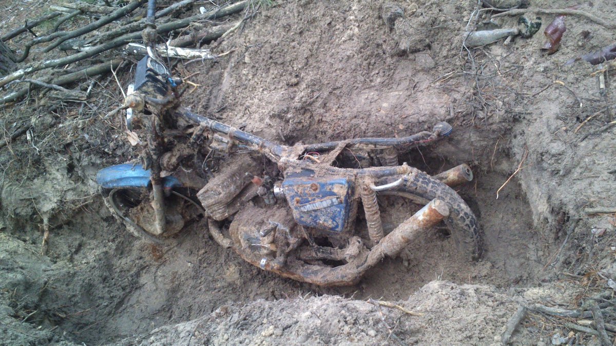 Очень погнут диск переднего колеса,как будто врезался.Может мотоциклист в той же яме.Если человек и мотоцикл "пропали безвести" и в розыске,то могут быть проблемы.