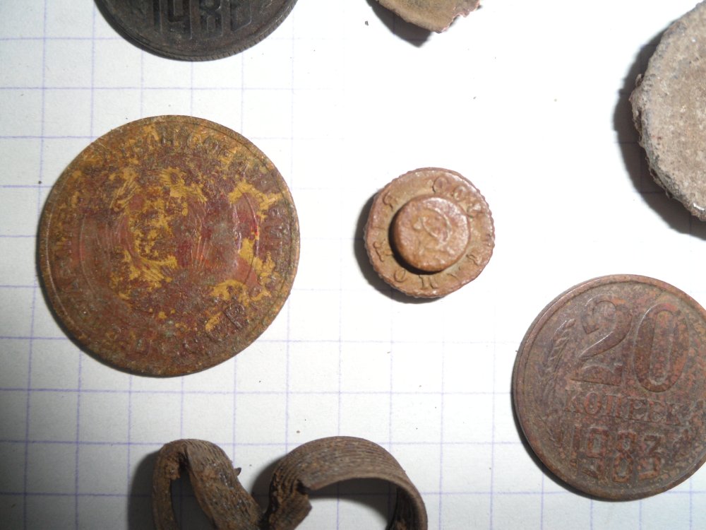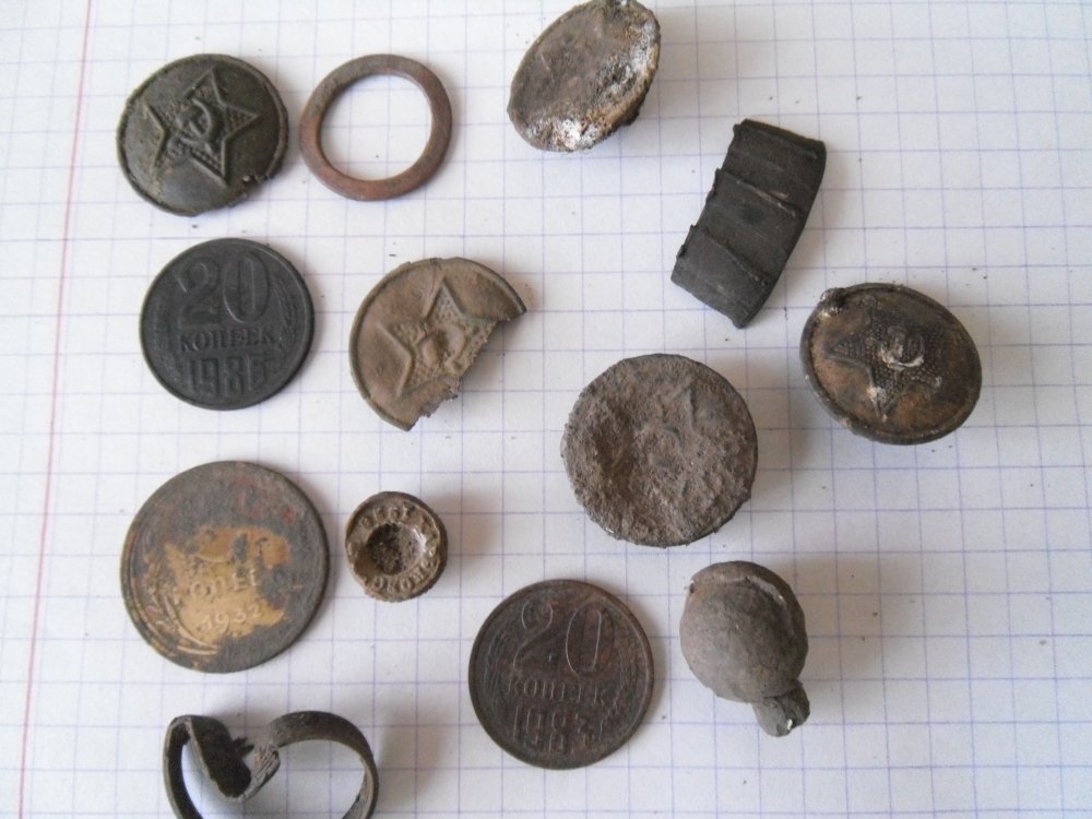 С утра позвонил товарищ, договаривались куда нибудь поехать. Но начинался дождь, решили не ехать. Часов в 10.00 вышло солнце, решил пройтись по ближайшему лесу. Сигналов было немного, в основном гильзы, несколько монет ( ранний СССР). Часа через полтора обнаружил что потерял телефон - SAMSUNG на 2 карточки. Поиски длились около часа, но телефон нашёл. Больше не копал. Попалось медное колечко, похожее на обручальное. Вот что накопал: