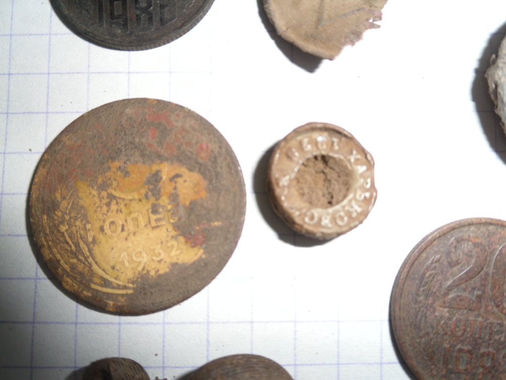 Сегодня вышел на старое место ( всё тот же лес). Больше часа выдержать не смог - жара ужас. Находки не очень. 5 коп 1932 г., пуговицы. Но попалась очень интересная свинцовая пломба. Я по крайней мере таких не встречал. Сохран очень хороший. Надпись с одной стороны: "таможня 200" и серп и молот. На обратной стороне "Харьковская 1928". Гурт рубленный.
