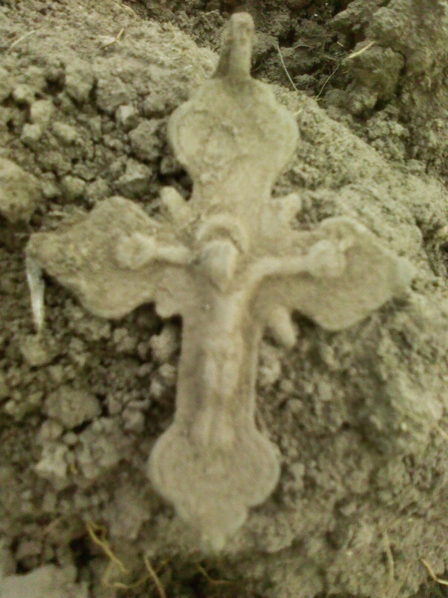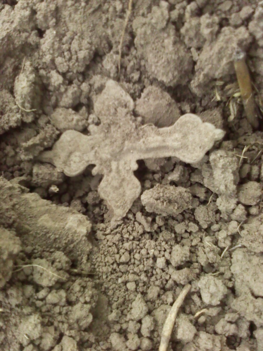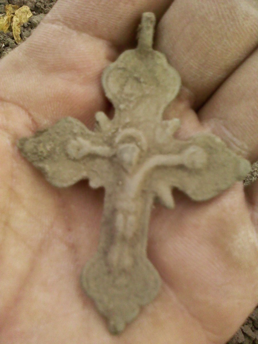 Добрый вечер,шановни камерады.Прошелся я по-домашнему на лужок,проверить растаял ли снег.Таки да.Пришел,залез в бульдозерный шурф. И месил грязь только в нем.Только в одном трактор дернул керамику и бутылки.Наловил ВРП 1722,2 коп 1937,Пуга-анличанка Курской губернии и оловянный крестик,ранний.Клещ был один по дороге на луг.Сонно прицепился-получил щелбан-улетел в траву.Но баллончик брал,вчера еле купил.оказывается в магази ны еще не завозили.