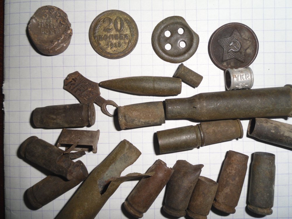 Сегодня отдыхали с семьёй на даче. Но под вечер решил взять свой боевой Фишер и пройтись по знакомым местам. Сначала шли гильзы, притом очень разные - 7,65 мм Браунинг, 9 мм Люгер, 7,62 мм ТТ, Мосин. Даже одна от Бердана попалась. Уже когда собирался сворачиваться порадовала свинцовая пломба, дореволюционная с надписью 3х Л, ЛПЗ, Боев. Что с большой вероятностью можно трактовать как 3х линейные, Луганский патронный завод, боевые ( возможно Боев- это фамилия контролёра) и 20 копеек 1925 года.
