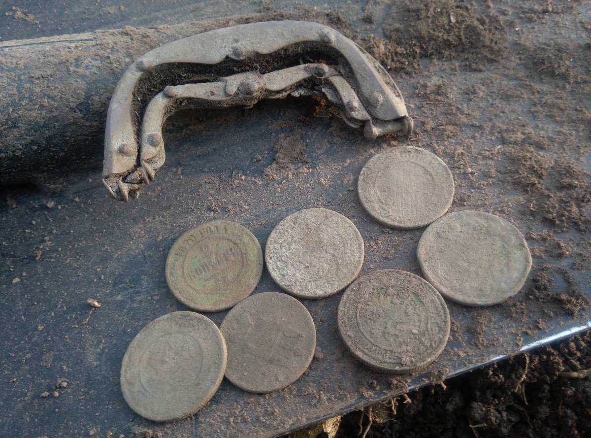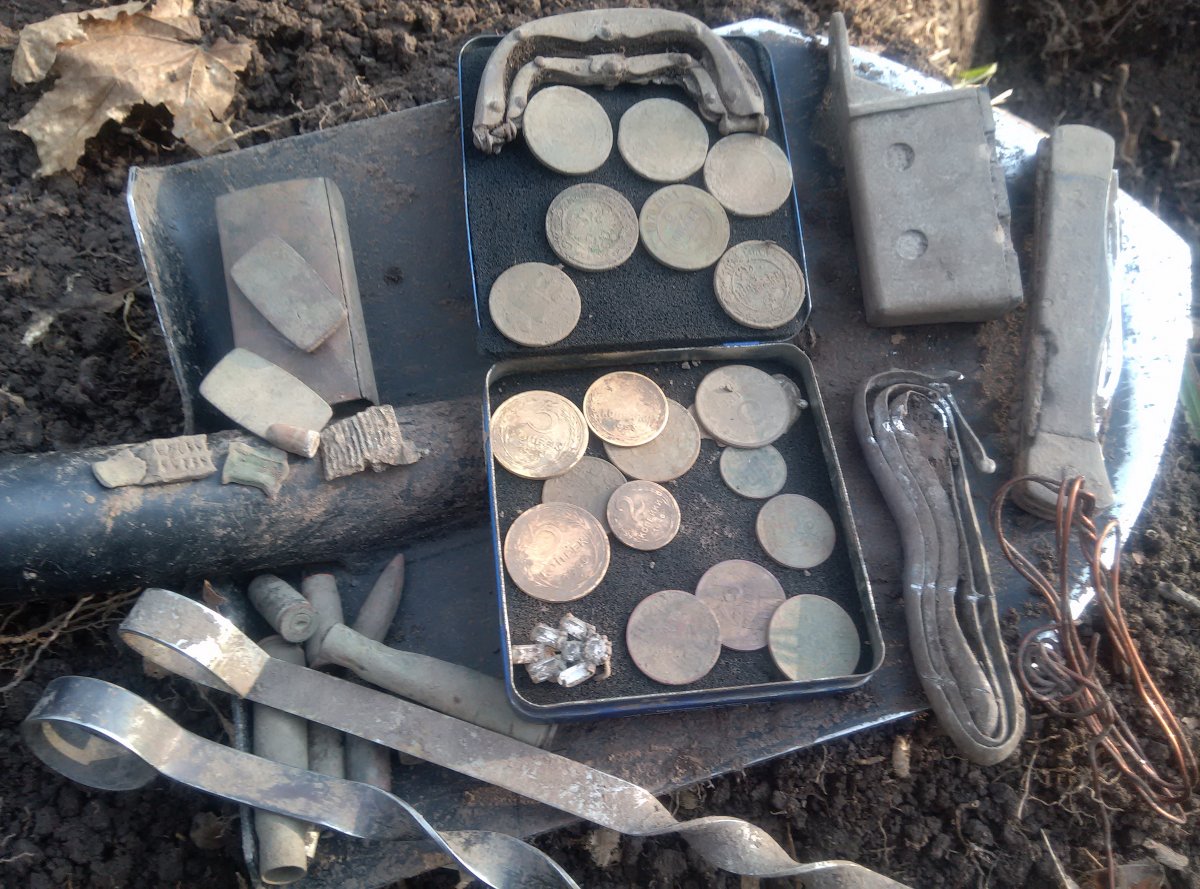 Доброго вечера, камрады Походил сегодня по ЛП. До обеда довольно бодро клевали советики, а потом как отрезало.. Около пяти вечера решил двигать домой минут через 20-30. И тут Дед подкинул (да-да, карта слезу любит ) первый мой царёв кошель (с останками сопсно кошеля): Ну, и итог за выход: Пока шел к бревну для собираться выскочили еще двадцун дореформа и патрон с мельхиоровой пулей - уже не фоткал. Жаль, что зажигалка (верхний левый угол) некомплектная накопалась. Всем добра