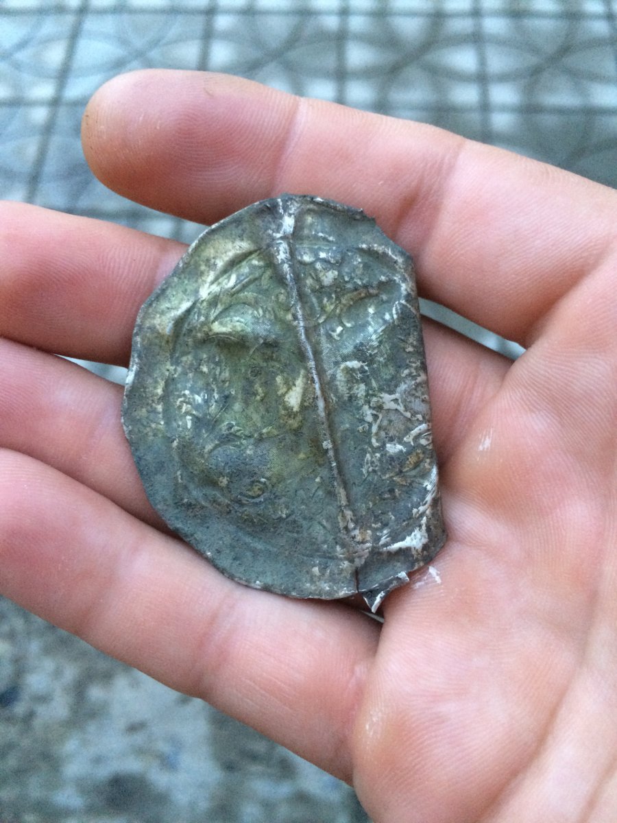 Когда-то также попался кусочек медяшки в форме манюсенькой скомканой трубочки,даже удивляюсь,как его сразу не выкинул,в итоге дома случайно доглядел,что какой-то этот кусочек не такой,в итоге фальшак полторака 1623г.