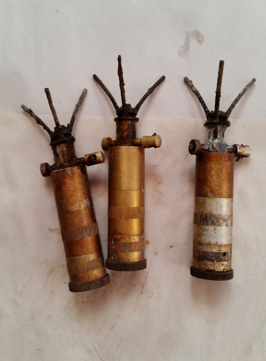 Всем доброго вечера. Выбрался по местному на полтора часика в лес. Грибы какие-то странные попадались, вроде белый - а вроде и не похож: Полазил полчаса по сосне, нашел только одну гильзу. Потом дай думаю спущусь в небольшую ложбинку - а там поперли большие осколки. В общем, до заката времени было мало, решил там порыться. Наряду с железом попадались медные пояски, некоторые - очень даже радостно было копать. Вот например на 200 грамм: Место не совсем понятное - посредине вырыта яма 2х2 м, в ней и вокруг по всей ложбине (20х20) полно крупных осколков. Сапёры что-ли уничтожали снаряды? Ещё попалась парочка целых: Не доводилось такие находить, взрывак латунный и с необычным носиком. Кто знает, что за вундурвафля? Ещё попалась такая косточка в ямке с пояском, может человеческая? Ну и итог за полтора часа - 13 кг железа и чуток меди.
