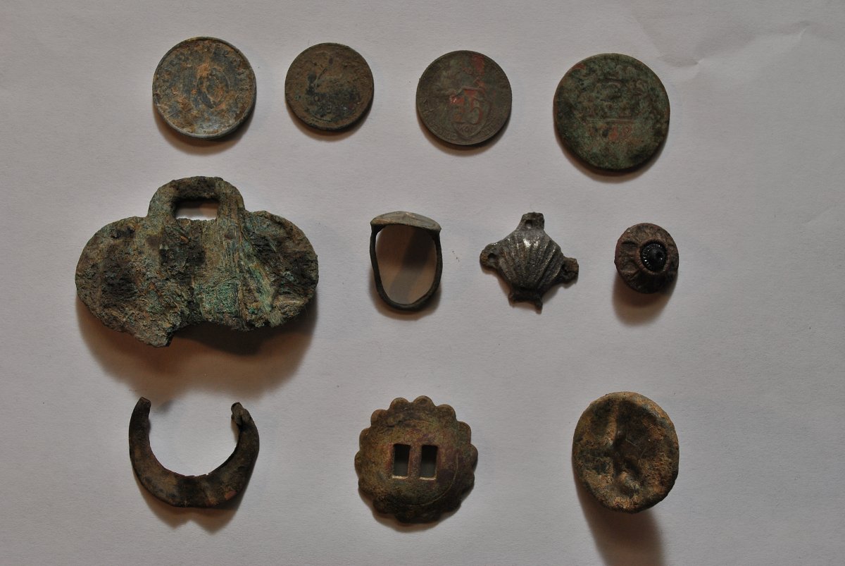 Сегодня было жарко, поэтому все находки пришлось выкапывать до обеда. Надеялся что перстенек желтый но просто грязный, поэтому тер его до дыр). Напоследок попался жуткий дворик с повешенными манекенами, грустным буратино и раздутым американцем.