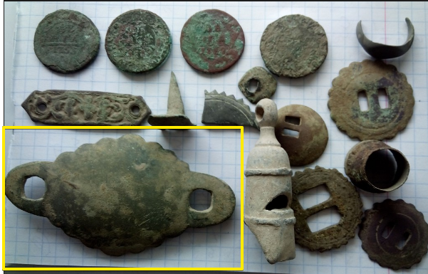 Ах да, ещё вчера вылезла такая бронзовая штукенция на советском домике (но и домик возле наконечников), очень похоже на своеобразные бронзовые удила того времени. Или мне только кажется?