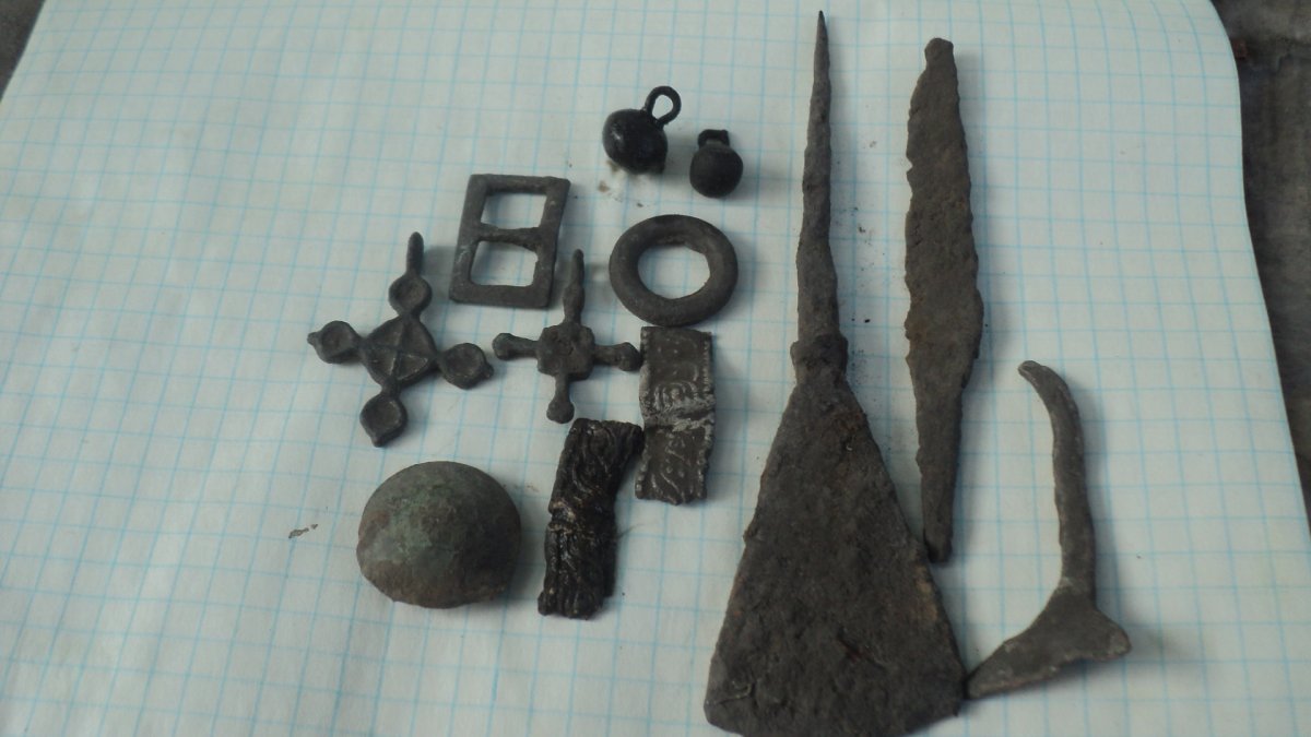 Добрый вечер,всем.Сегодня с камрадом выехали на коп по свежоораном поле.Находки на фото. 2 крестика,один с остатками эмали,2 гирьки пуговки,2 обломка,похоже браслета,наконечник стрелы и ножичек.Да ещё гильзач его не фоткал,ну и кил10 чермета.Камрад тоже поднял 2 крестика с эмалями,жалко один с утратами.Вот как то так.Всем удачи на копе.