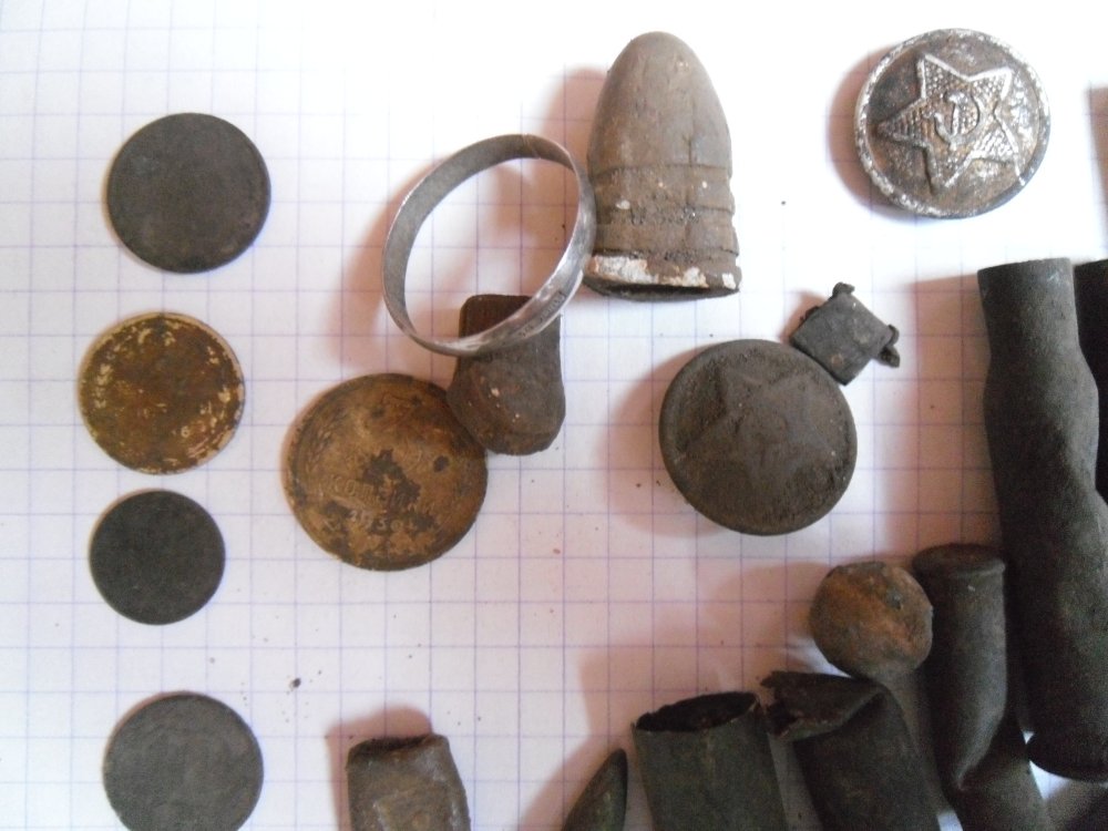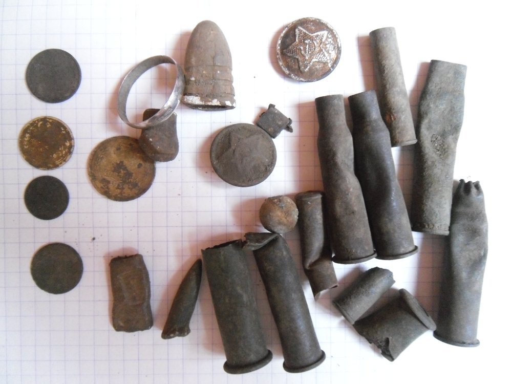 Вот сегодня побродил по лесу 4 часа. Среди находок несколько монет, гильзы ( притом разной хронологии - от дореволюционных Мосина до 60-х годов). Порадовала пуля Миньё от карабина Энфилда времён Крымской войны, смятая пуля Бердана ну и колечко обручальное. Материал - серебро, а вот проба интересная, дореволюционная, в золотниках ( 84 ) современная 875 проба. Ещё пломба свинцовая интересная попалась 1917 года.