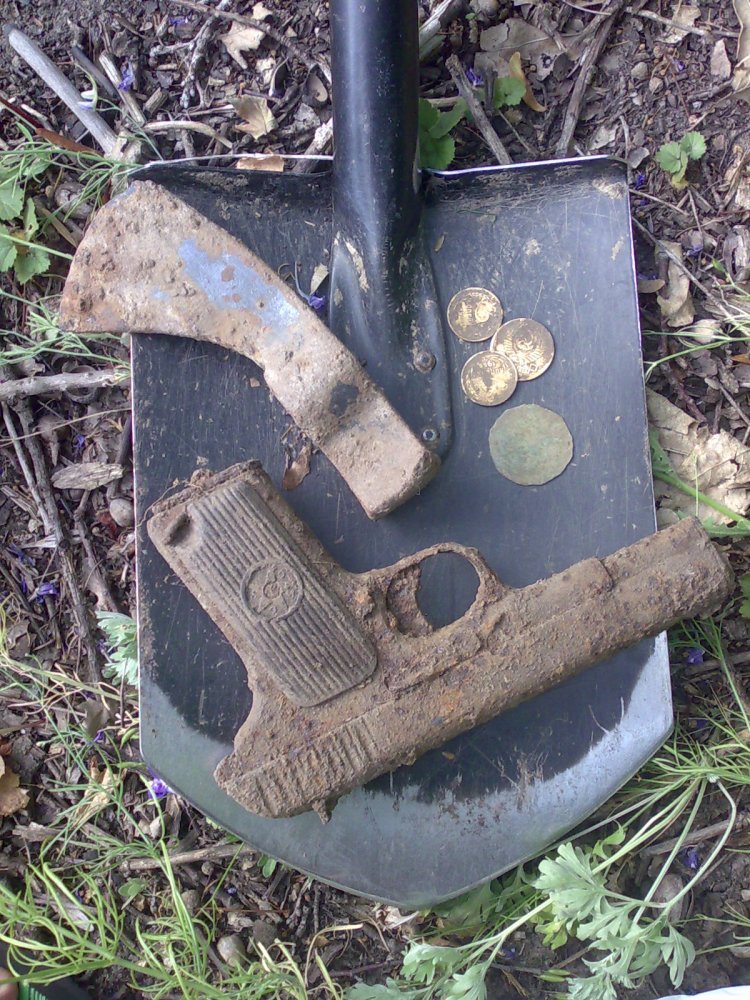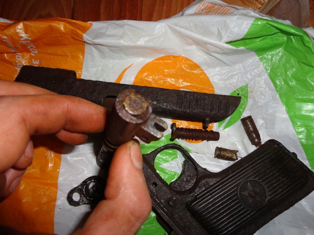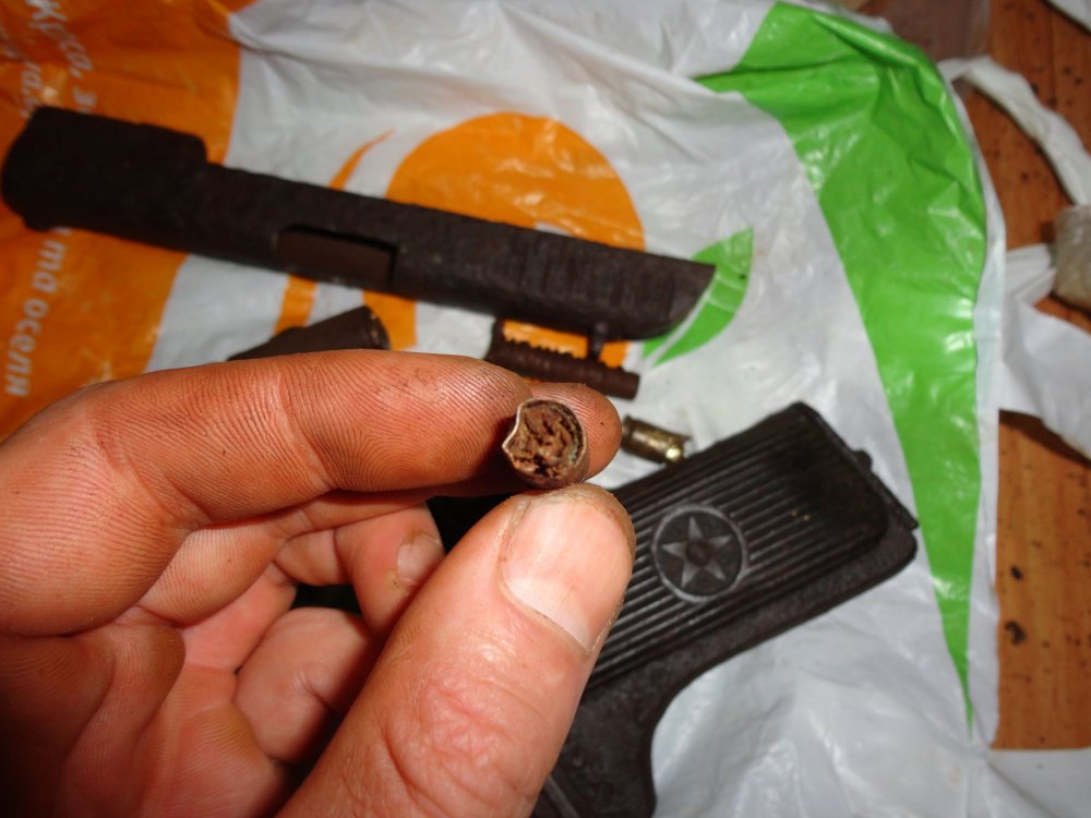 ТТха интересна тем что заряжена была патронами по 44году,вместо пуль были бумажные шарики и немного пороха,нарезов по стволу не видно,рядом с ТТ был найден игрушечный пистоль который в руках розсыпался от времени....