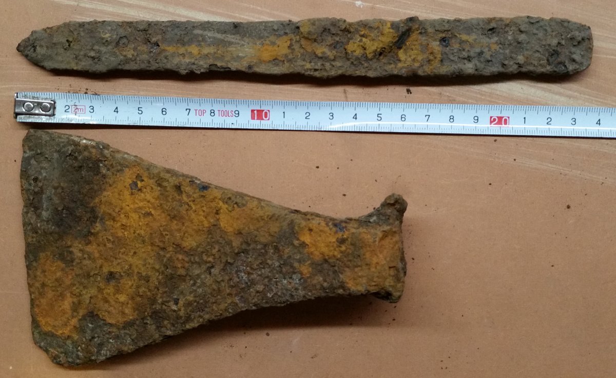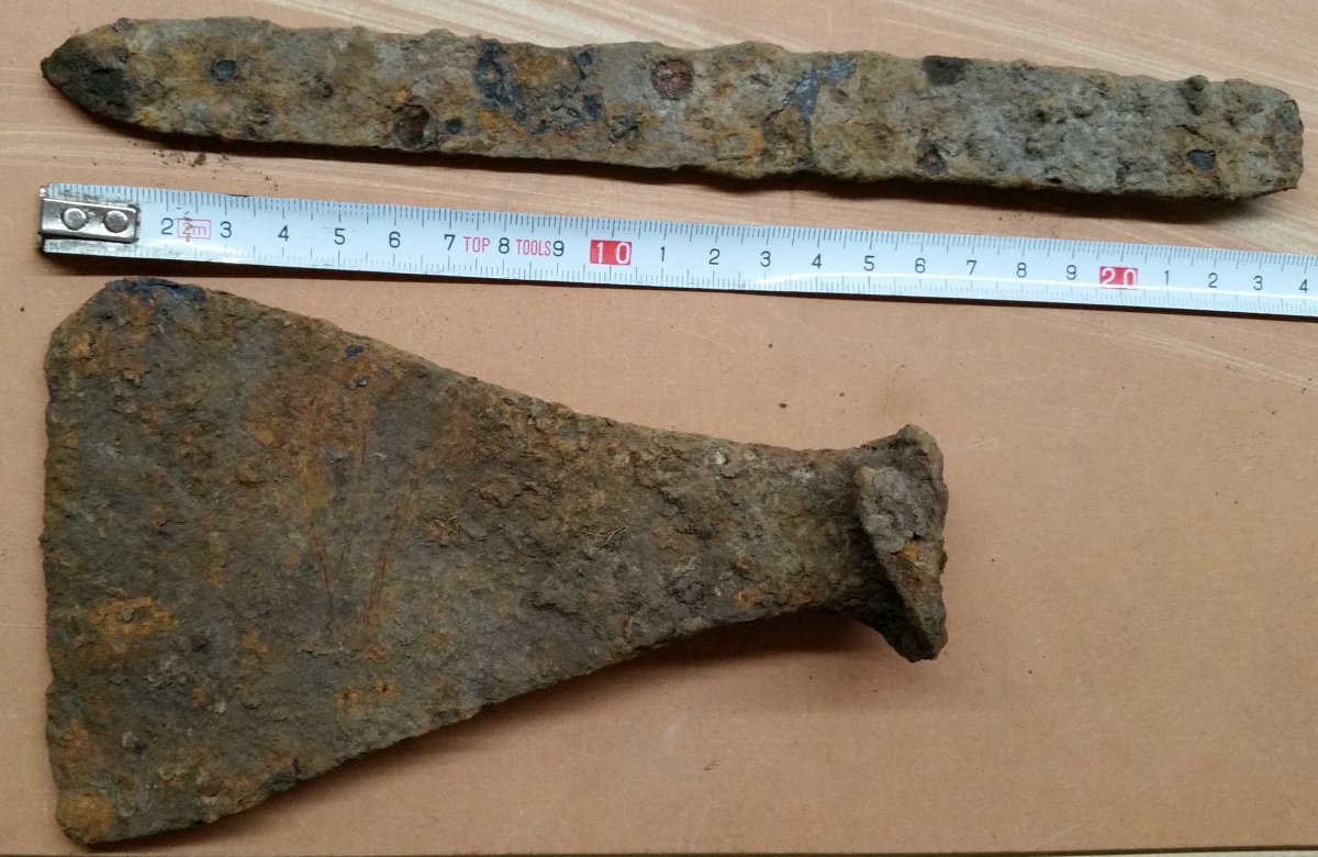 здравствуйте! Сегодня на поле нашел что то типа топора, а рядом в лесочке остаток то ли ножа, то ли штыка. Может кто подскажет, что оно такое было?