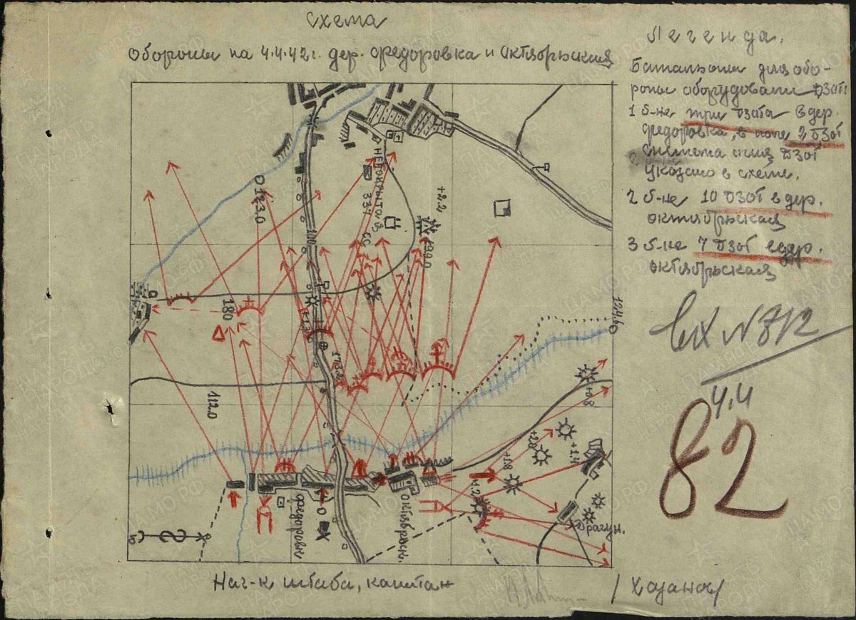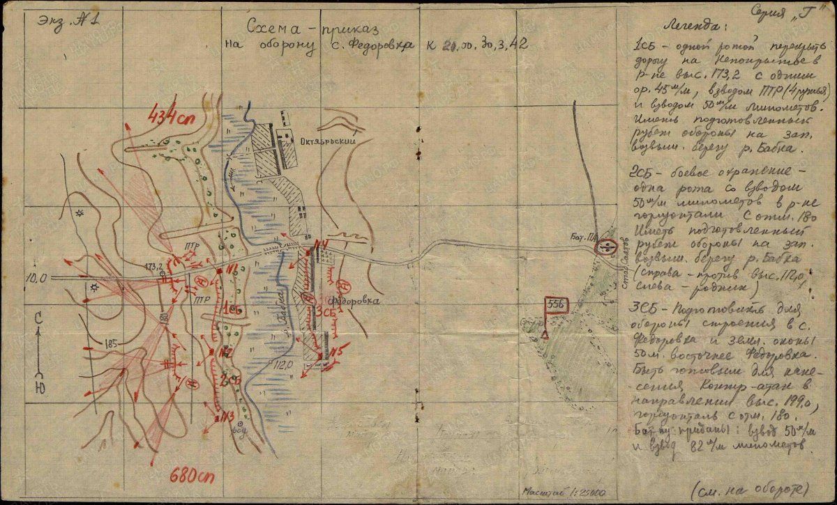 Схема - приказ на оборону с. Федоровка. 30 марта 1942 года. До кучи, схема обороны 987 сп района Федоровка, Октябрьская. 3 и 4 апреля 1942-го.