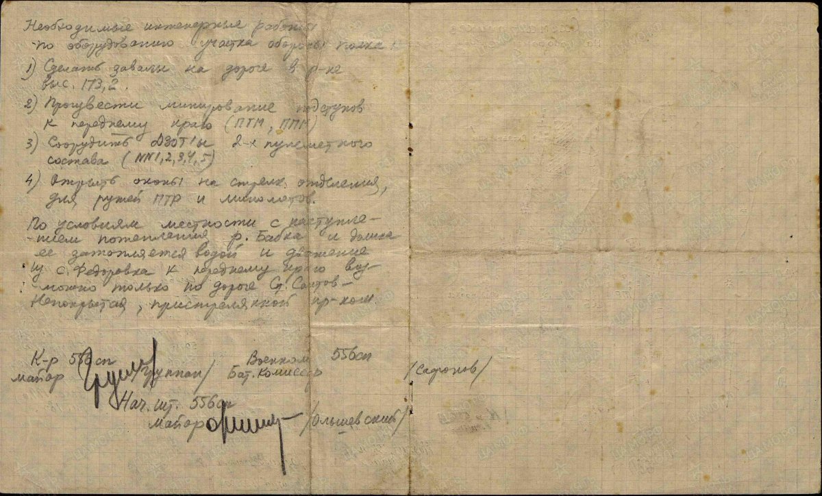 План работ по укреплению участка обороны 987 сп на рубеже сел Октябрьское-Федоровка от 26 марта 1942 года. Это в дополнение к картам выше. А также Приказ по Старо-Салтовскому гарнизону от 31 марта 1942 года. Нашлись ещё другие занятные схемки по весне 42-го округи Старого Салтова.