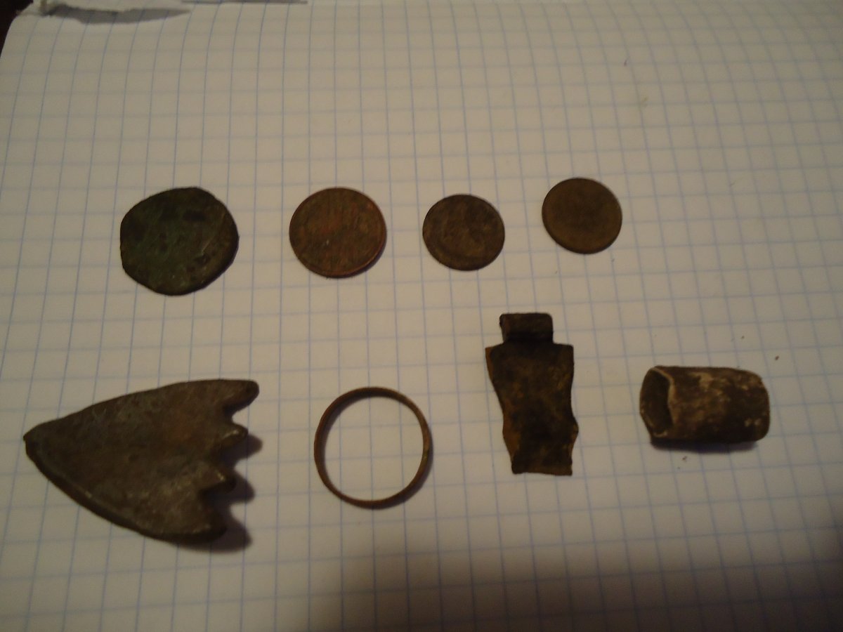 Добрый вечер братья Камрады, сегодня выбежал к себе на луг на коп, ветер очень сильный, на улице +3 а ощущения на-5, проходил 2 часика и больше не смог, очень замерз хоть и в горнолыжном костюме был, по находкам не очень: кольцо обручалка медная, деньга какая-то не понятная и 3 совета, а ещё какая-то при блуда, сплав не пойму, вот и всё! Всем добра и кладуху под катуху!!!!!